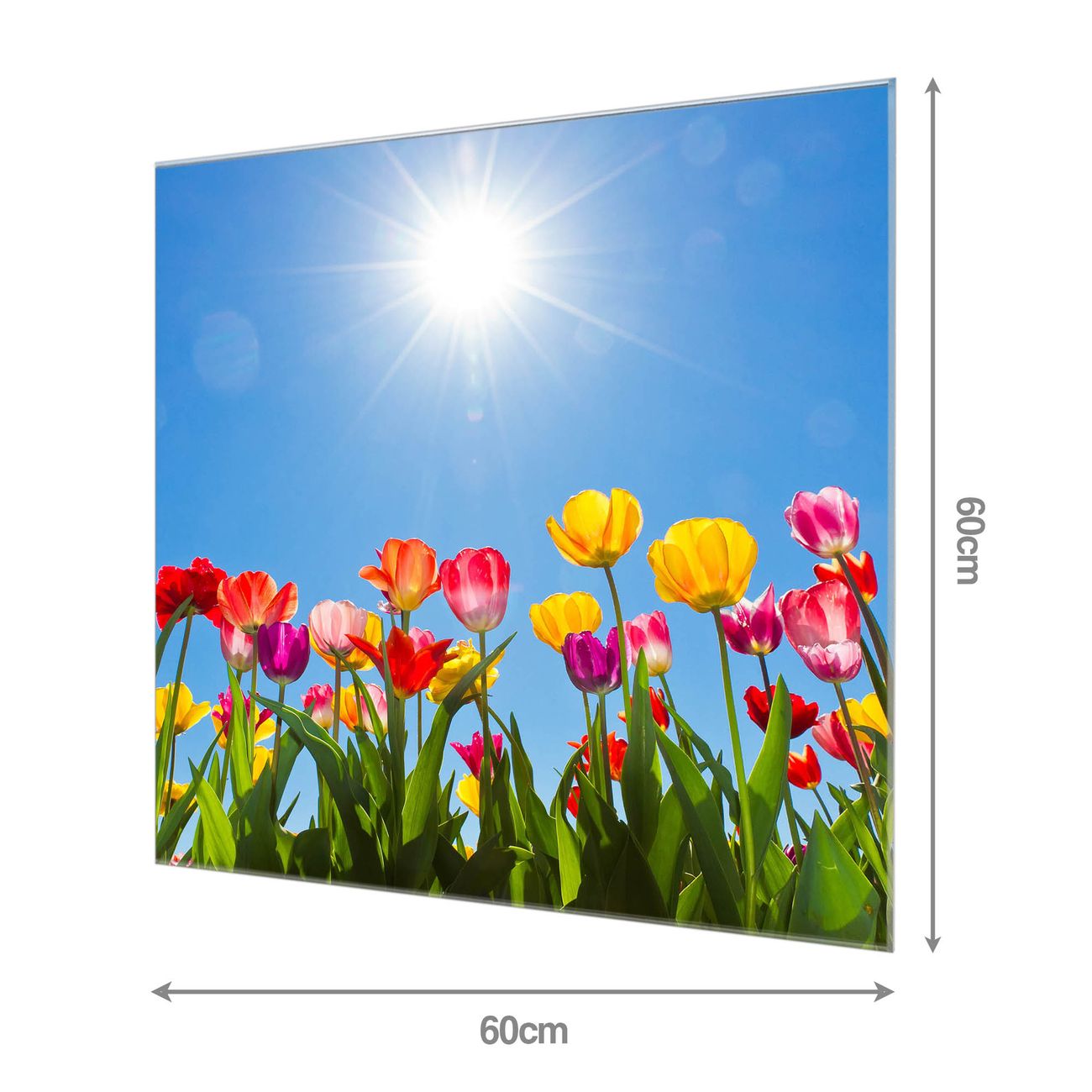 Material: 4mm Sicherheitsglas mit Metallrückwand Eigenschaften: beschreibbar, magnetisch, kratzfest Maße: 60x60x0,6cm, 7,56 kg schwer Motiv Nummer 10211 Tulpenmeer Zubehör: inklusive 4 Neodym-Magnete