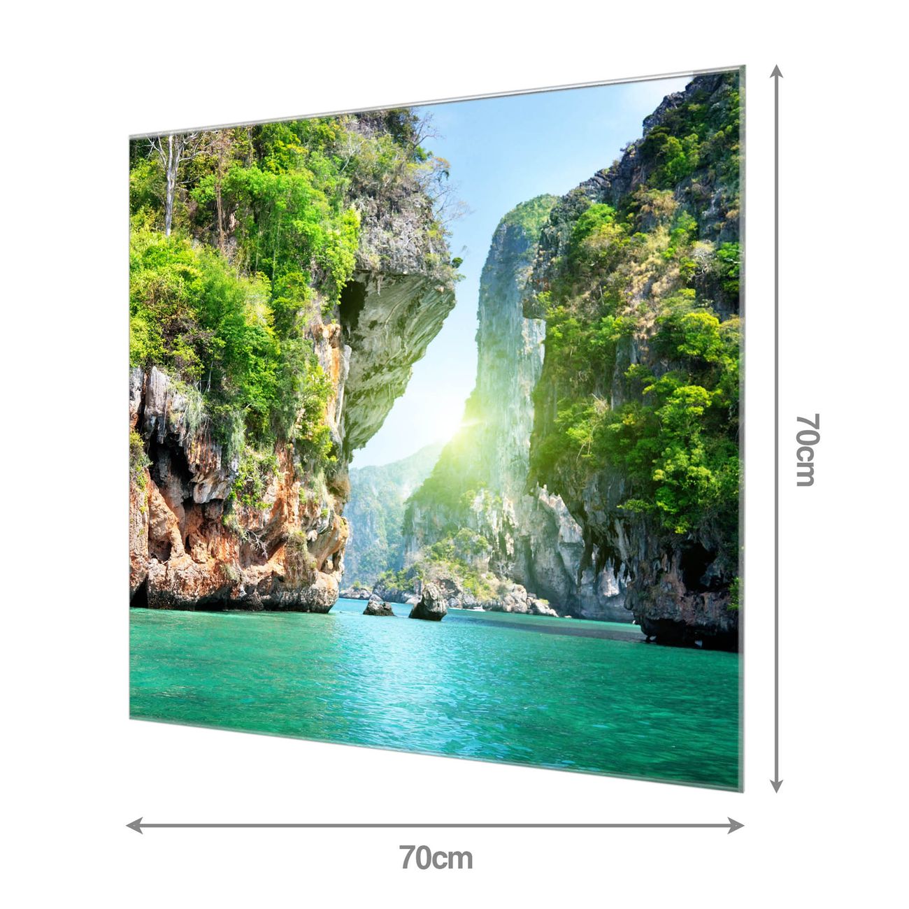 Material: 4mm Sicherheitsglas mit Metallrückwand Eigenschaften: beschreibbar, magnetisch, kratzfest Maße: 70x70x0,6cm, 10,50 kg schwer Motiv Nummer 12266 Versteckte Bucht Zubehör: inklusive 4 Neodym-Magnete
