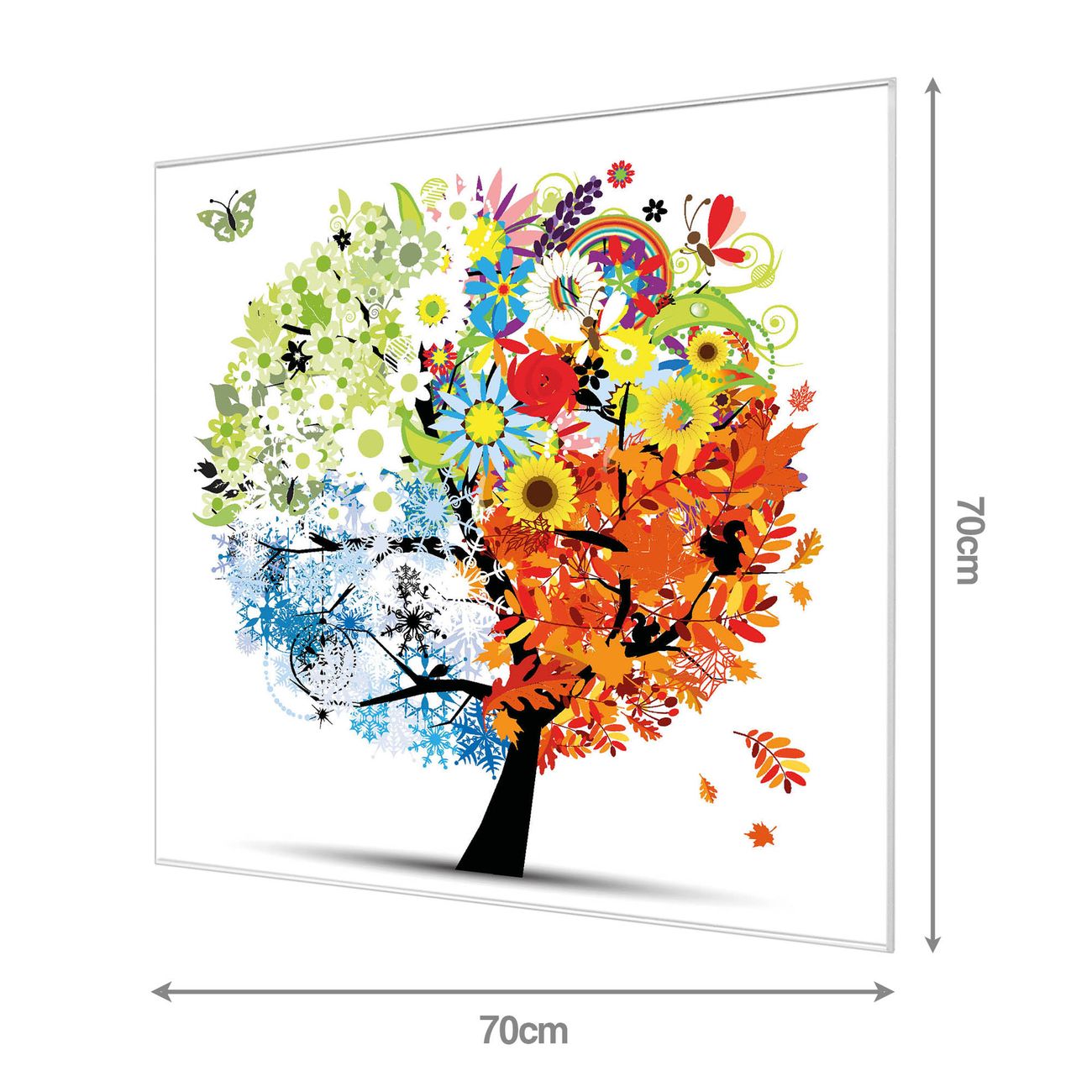 Material: 4mm Sicherheitsglas mit Metallrückwand Eigenschaften: beschreibbar, magnetisch, kratzfest Maße: 70x70x0,6cm, 10,50 kg schwer Motiv Nummer 11067 Vier Jahreszeiten Zubehör: inklusive 4 Neodym-Magnete