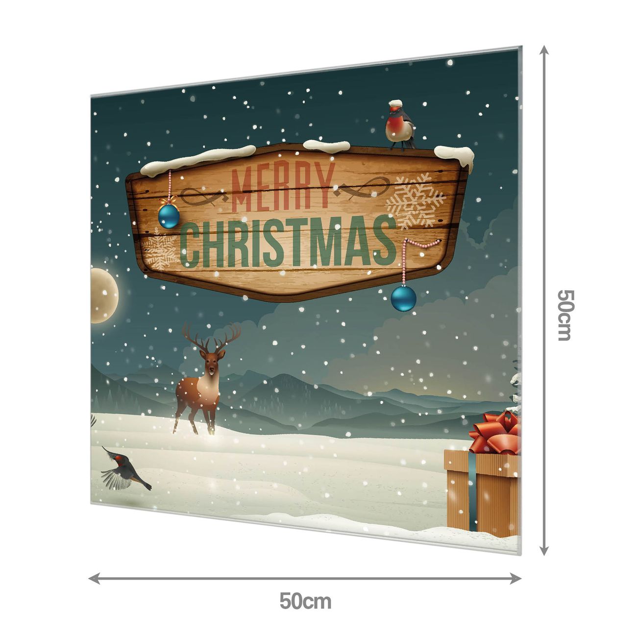 Material: 4mm Sicherheitsglas mit Metallrückwand Eigenschaften: beschreibbar, magnetisch, kratzfest Maße: 50x50x0,6cm, 5,25 kg schwer Motiv Nummer 12543 Weihnachtsland Zubehör: inklusive 4 Neodym-Magnete
