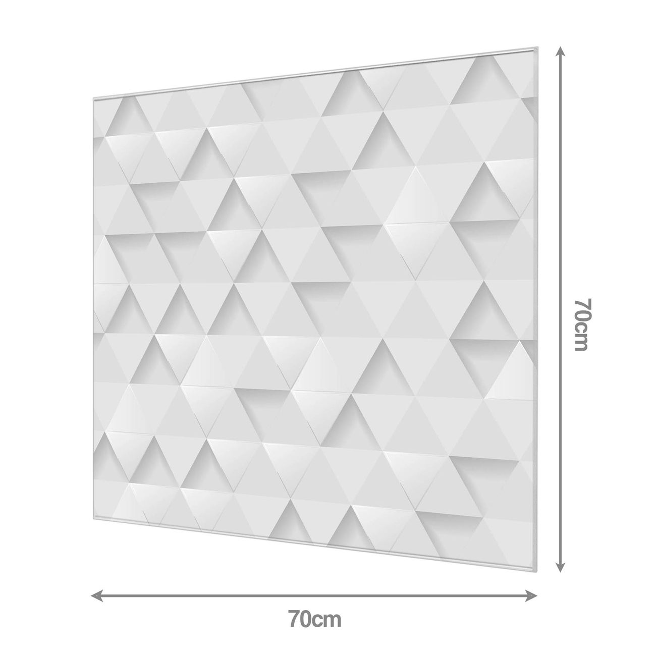 Material: 4mm Sicherheitsglas mit Metallrückwand Eigenschaften: beschreibbar, magnetisch, kratzfest Maße: 70x70x0,6cm, 10,50 kg schwer Motiv Nummer 12495 Weisse Dreiecke Zubehör: inklusive 4 Neodym-Magnete