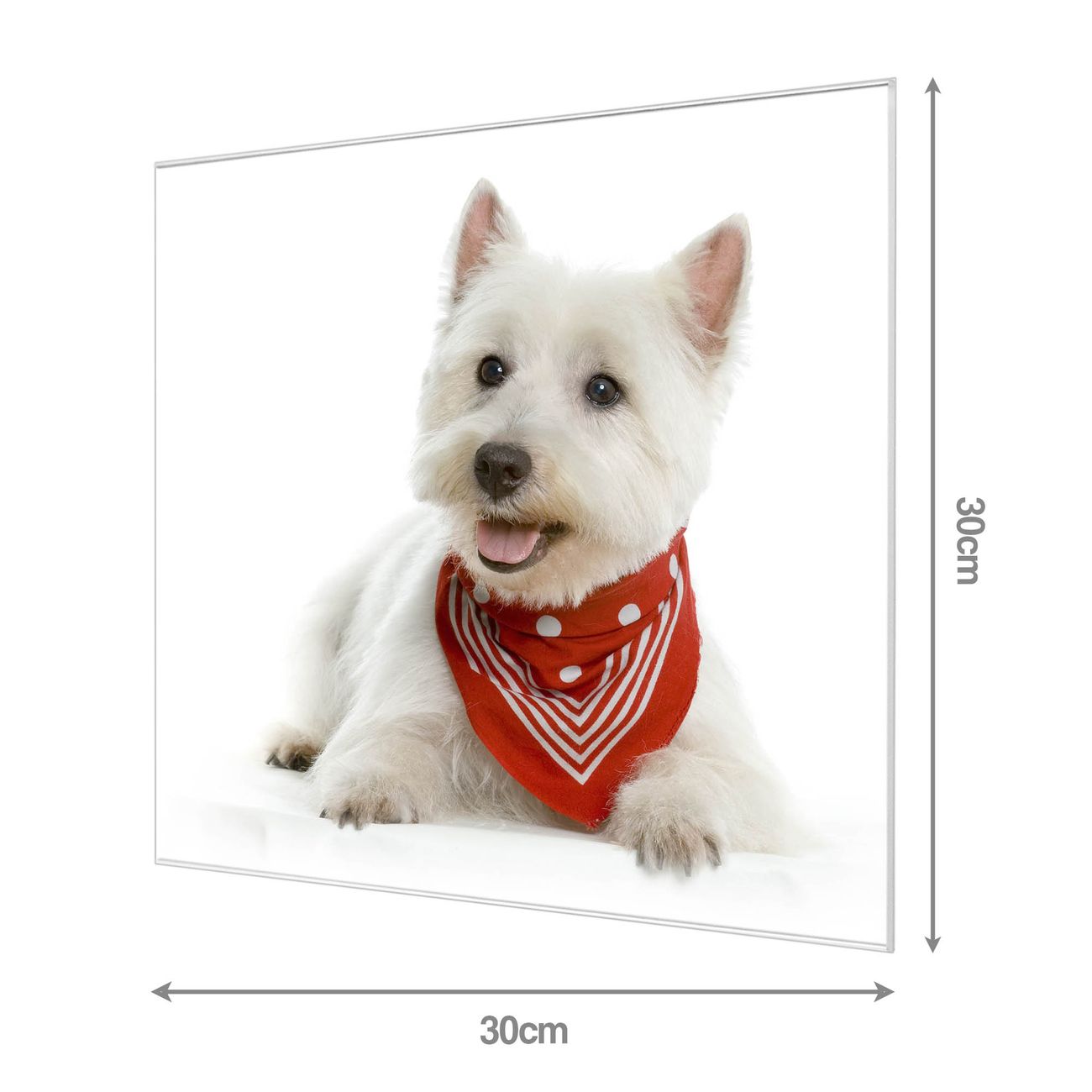 Material: 4mm Sicherheitsglas mit Metallrückwand Eigenschaften: beschreibbar, magnetisch, kratzfest Maße: 30x30x0,6cm, 1,89 kg schwer Motiv Nummer 10192 Westie Zubehör: inklusive 4 Neodym-Magnete