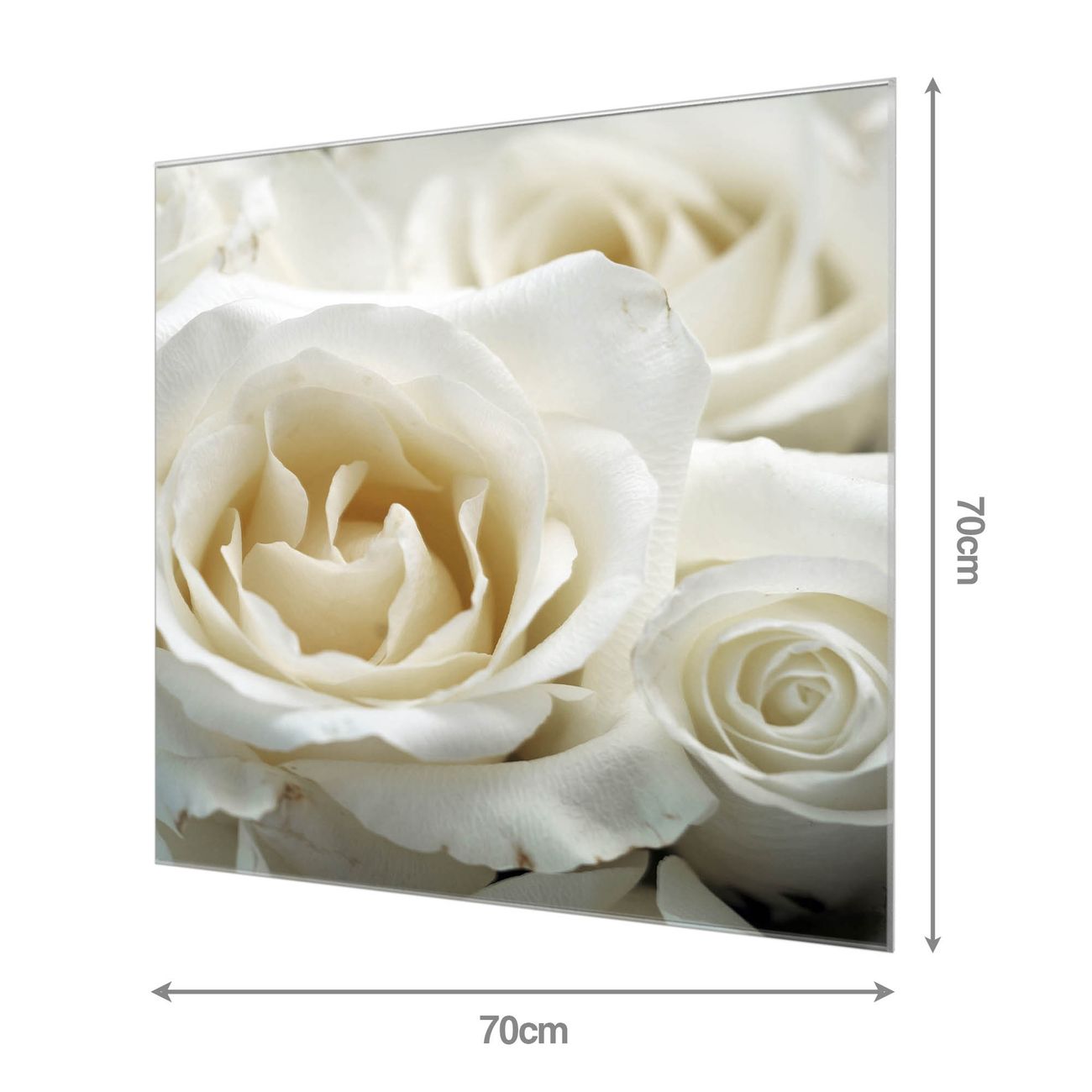 Material: 4mm Sicherheitsglas mit Metallrückwand Eigenschaften: beschreibbar, magnetisch, kratzfest Maße: 70x70x0,6cm, 10,50 kg schwer Motiv Nummer 10108 White Roses Zubehör: inklusive 4 Neodym-Magnete