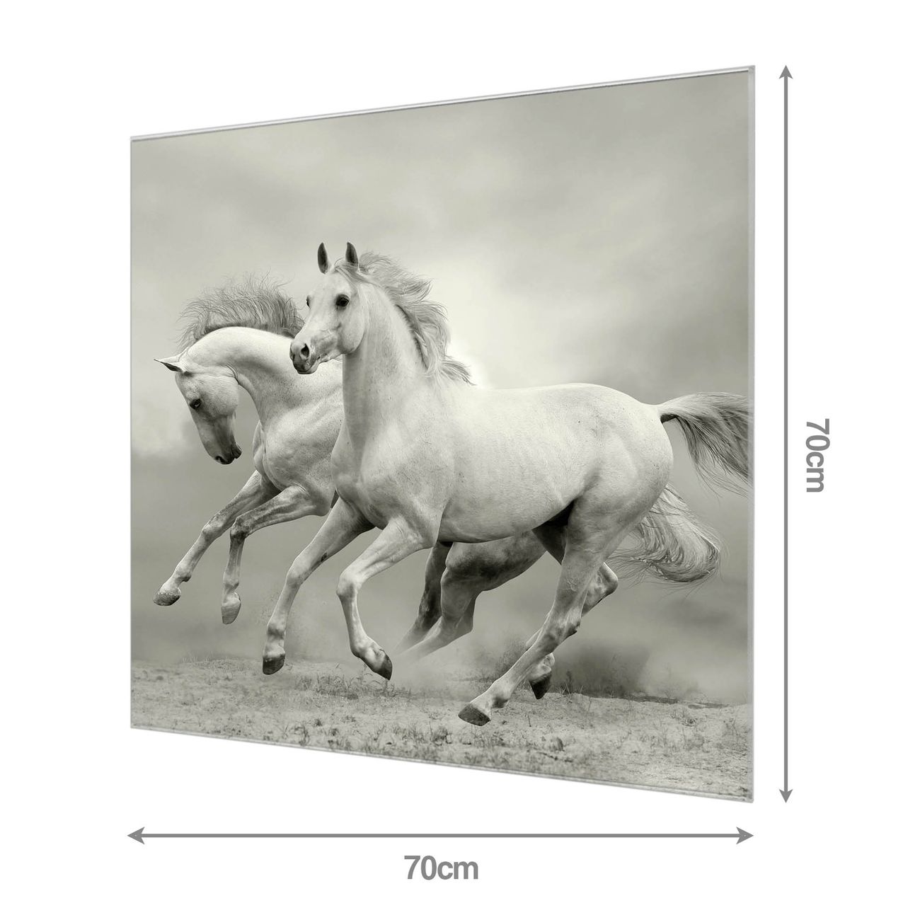 Material: 4mm Sicherheitsglas mit Metallrückwand Eigenschaften: beschreibbar, magnetisch, kratzfest Maße: 70x70x0,6cm, 10,50 kg schwer Motiv Nummer 11361 Wilde Pferde SW Zubehör: inklusive 4 Neodym-Magnete