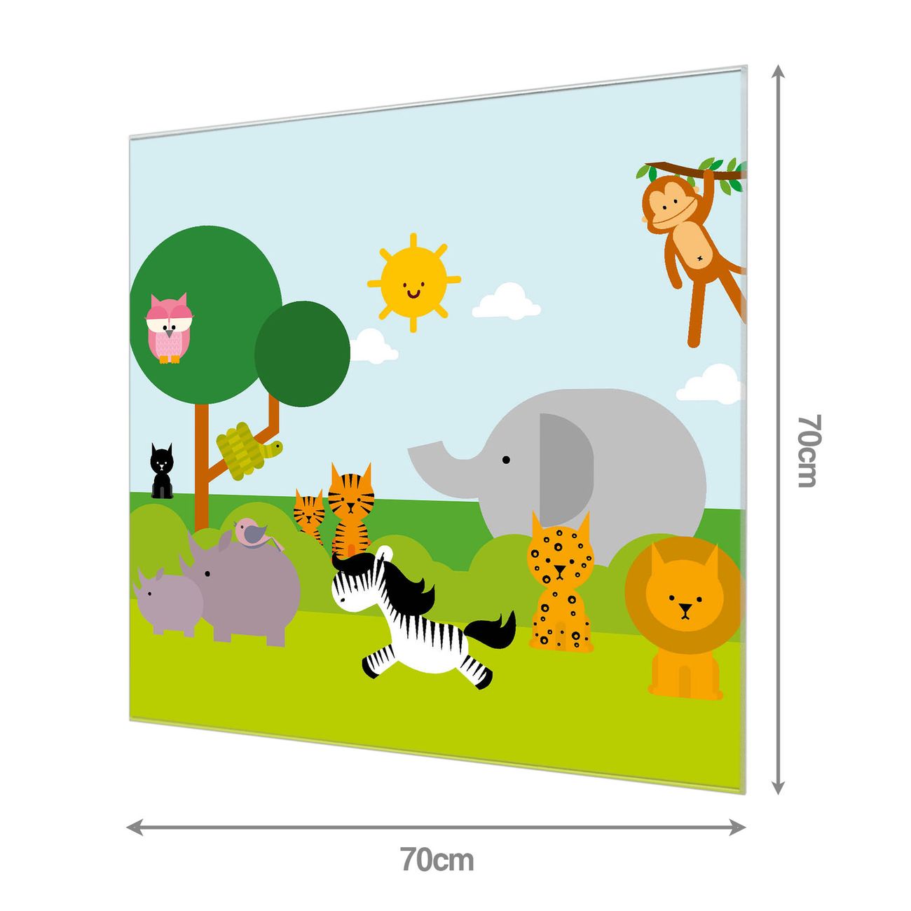 Material: 4mm Sicherheitsglas mit Metallrückwand Eigenschaften: beschreibbar, magnetisch, kratzfest Maße: 70x70x0,6cm, 10,50 kg schwer Motiv Nummer 11970 Wilde Tiere Zubehör: inklusive 4 Neodym-Magnete