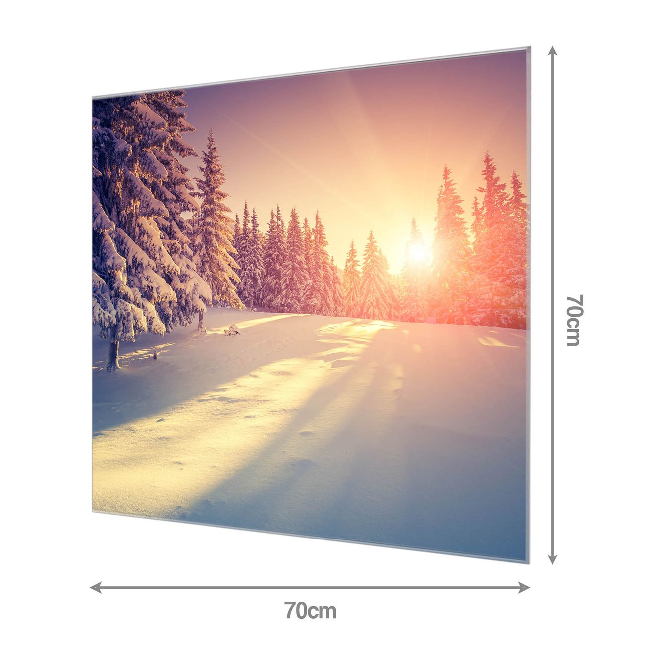 Material: 4mm Sicherheitsglas mit Metallrückwand Eigenschaften: beschreibbar, magnetisch, kratzfest Maße: 70x70x0,6cm, 10,50 kg schwer Motiv Nummer 12664 Winterabend Zubehör: inklusive 4 Neodym-Magnete