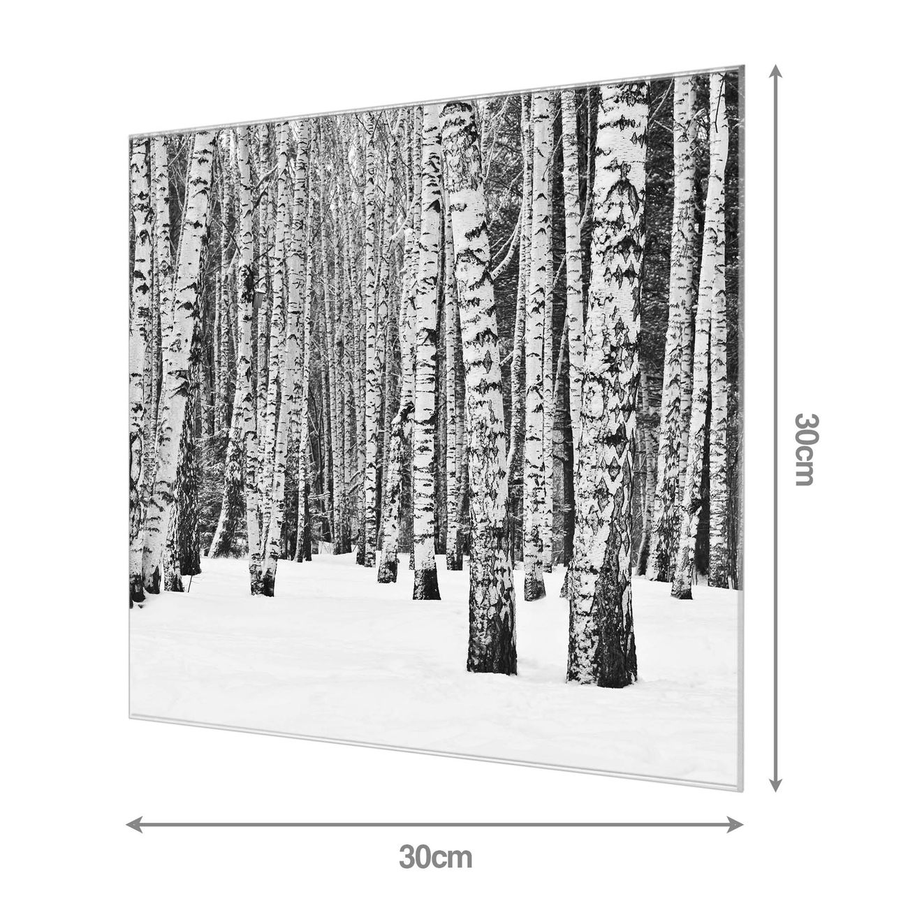 Material: 4mm Sicherheitsglas mit Metallrückwand Eigenschaften: beschreibbar, magnetisch, kratzfest Maße: 30x30x0,6cm, 1,89 kg schwer Motiv Nummer 12739 Winterlicher Birkenwald Zubehör: inklusive 4 Neodym-Magnete