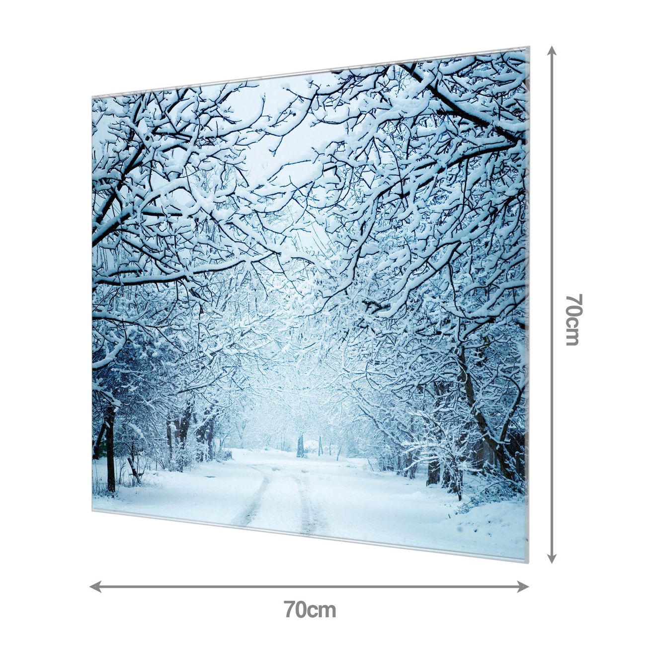 Material: 4mm Sicherheitsglas mit Metallrückwand Eigenschaften: beschreibbar, magnetisch, kratzfest Maße: 70x70x0,6cm, 10,50 kg schwer Motiv Nummer 12293 Winterspaziergang Zubehör: inklusive 4 Neodym-Magnete