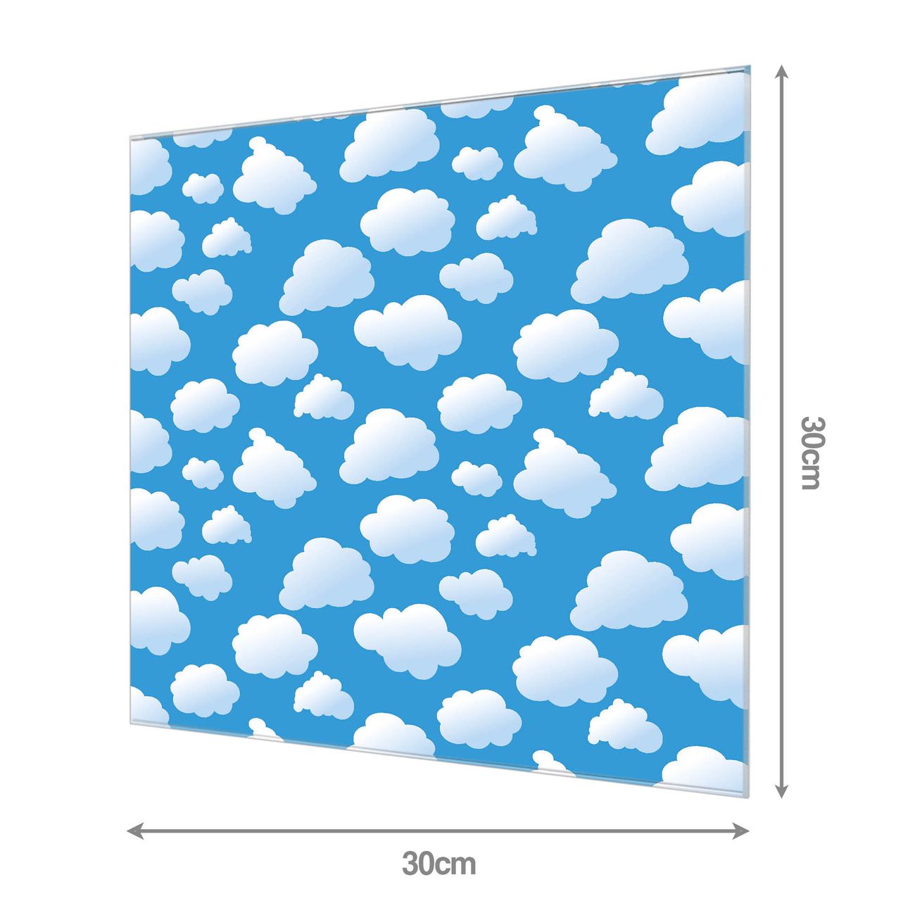 Material: 4mm Sicherheitsglas mit Metallrückwand Eigenschaften: beschreibbar, magnetisch, kratzfest Maße: 30x30x0,6cm, 1,89 kg schwer Motiv Nummer 10055 Wölkchen Zubehör: inklusive 4 Neodym-Magnete