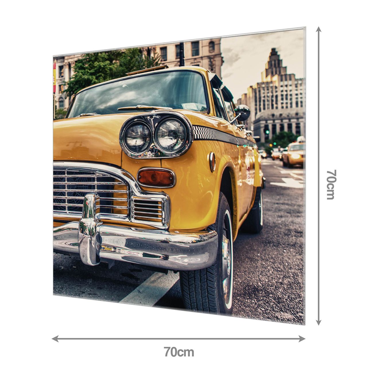 Material: 4mm Sicherheitsglas mit Metallrückwand Eigenschaften: beschreibbar, magnetisch, kratzfest Maße: 70x70x0,6cm, 10,50 kg schwer Motiv Nummer 12418 Yellow Cab Zubehör: inklusive 4 Neodym-Magnete
