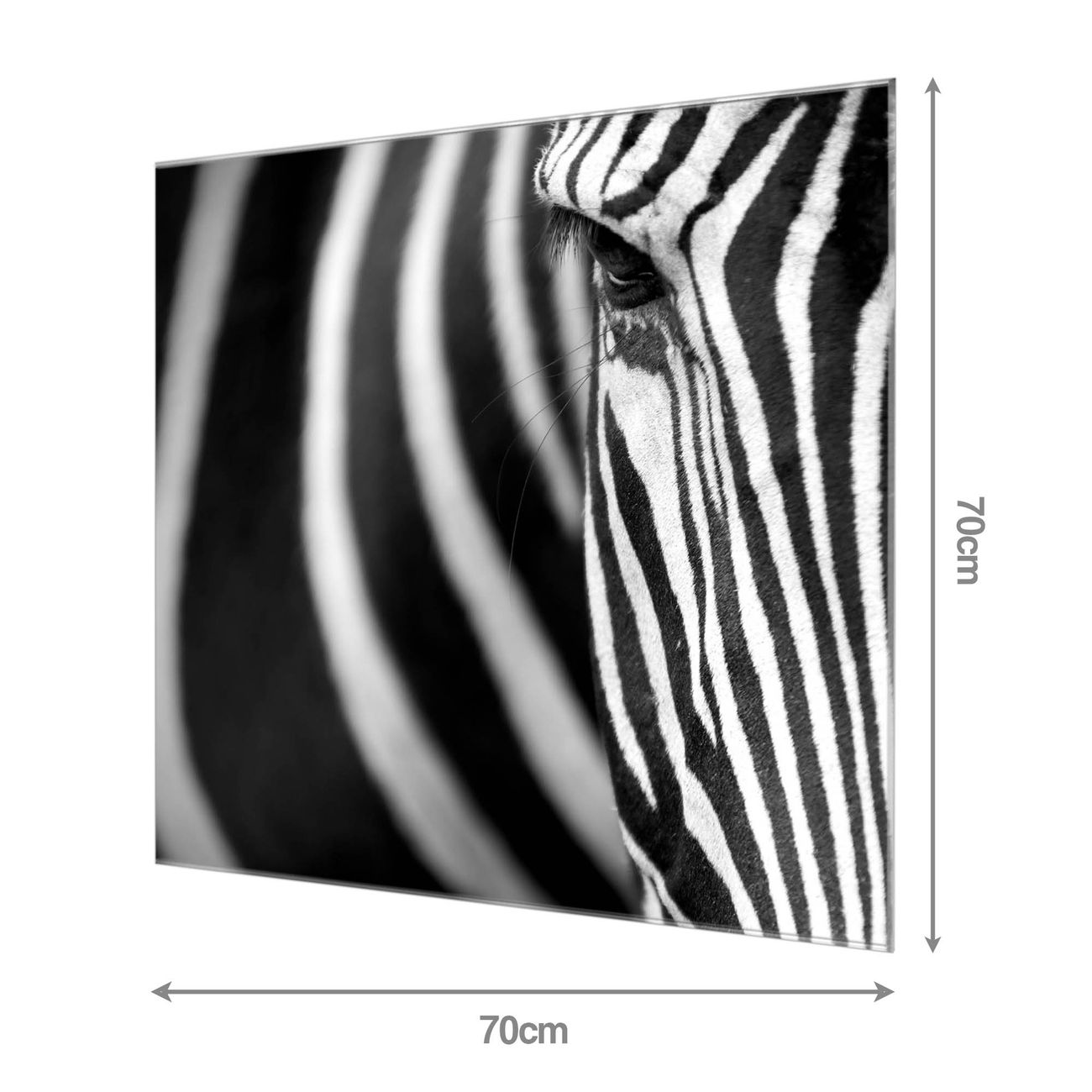 Material: 4mm Sicherheitsglas mit Metallrückwand Eigenschaften: beschreibbar, magnetisch, kratzfest Maße: 70x70x0,6cm, 10,50 kg schwer Motiv Nummer 12386 Zebra En Face Zubehör: inklusive 4 Neodym-Magnete