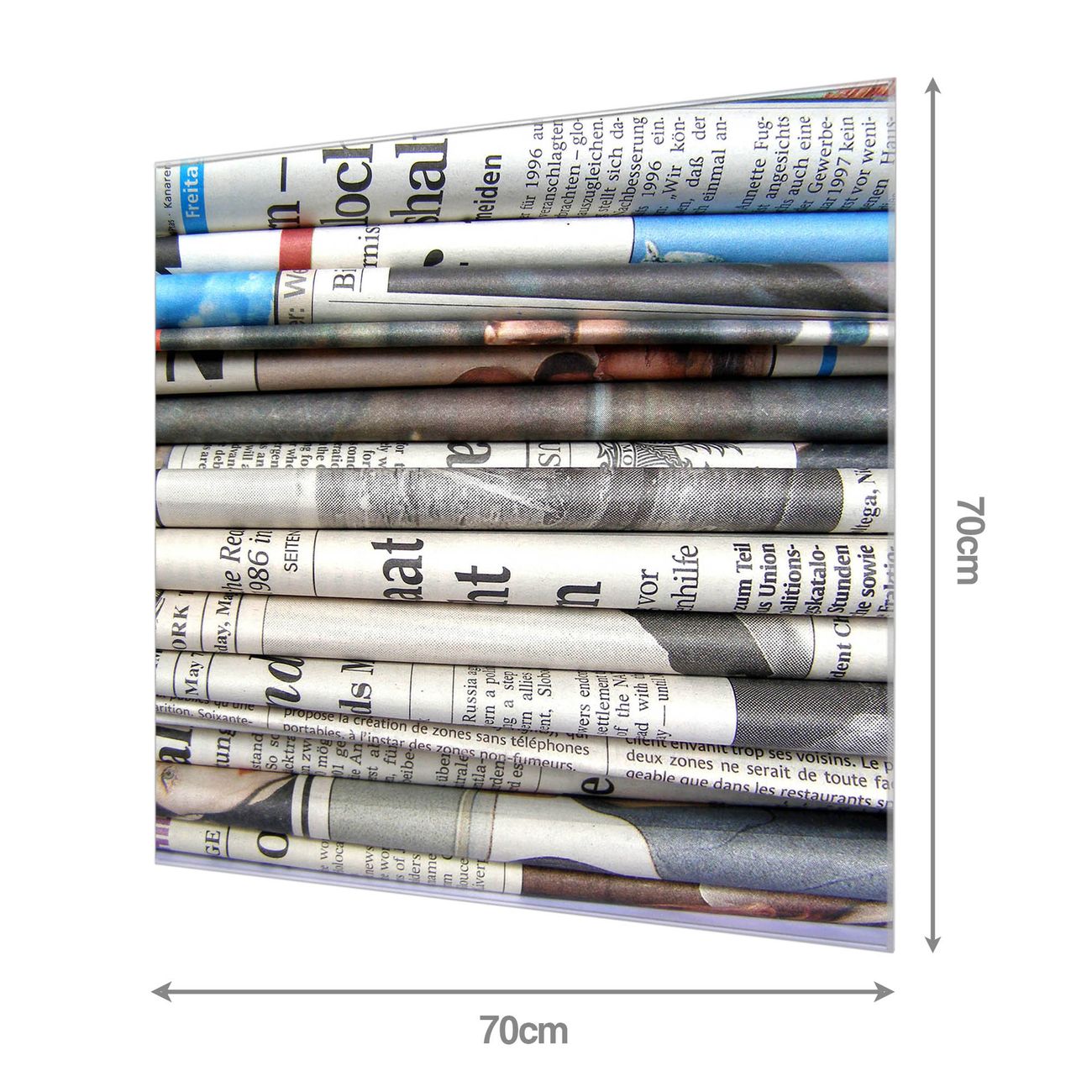 Material: 4mm Sicherheitsglas mit Metallrückwand Eigenschaften: beschreibbar, magnetisch, kratzfest Maße: 70x70x0,6cm, 10,50 kg schwer Motiv Nummer 10039 Zeitungen Zubehör: inklusive 4 Neodym-Magnete
