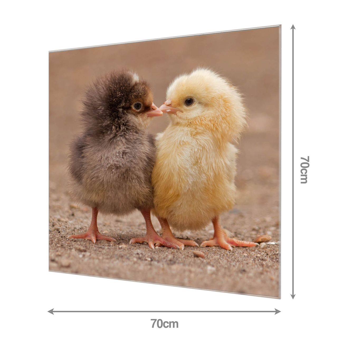 Material: 4mm Sicherheitsglas mit Metallrückwand Eigenschaften: beschreibbar, magnetisch, kratzfest Maße: 70x70x0,6cm, 10,50 kg schwer Motiv Nummer 12370 Zwei Küken Zubehör: inklusive 4 Neodym-Magnete