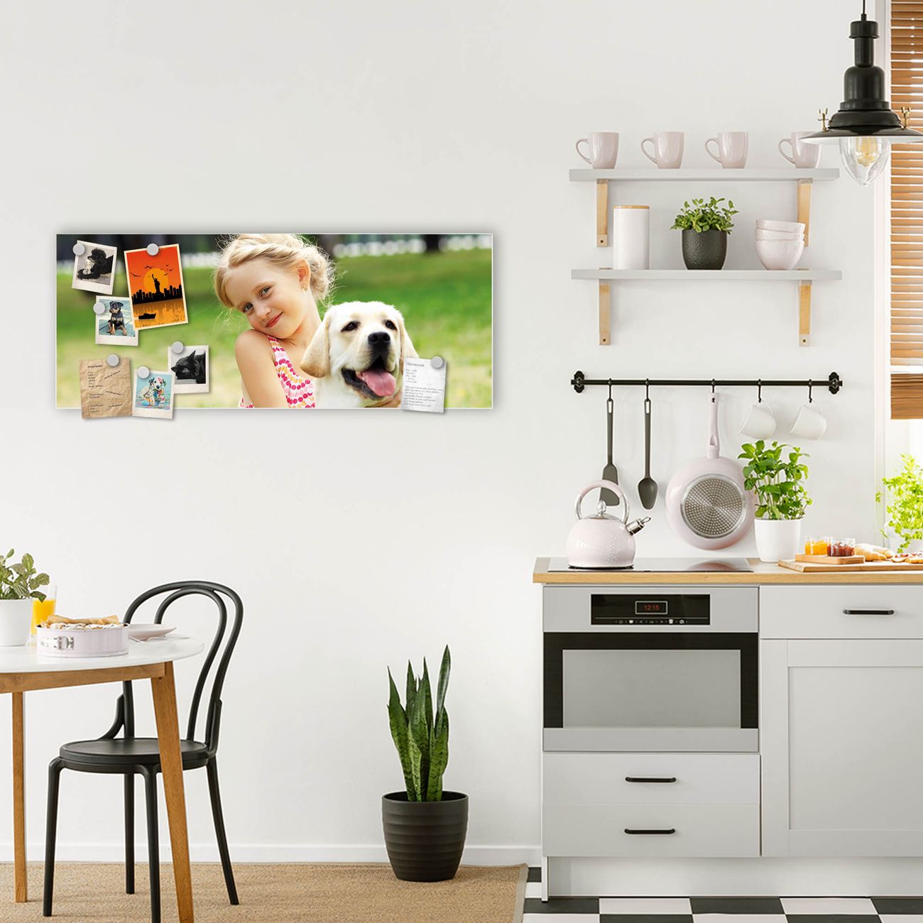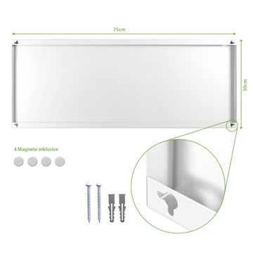 FUNKTION:  Die banjado Design Magnettafel mit dem Motiv Motiv Wunschmotiv bringt Ordnung in Ihr Zettelchaos. Fotos, Termine, Notizen oder Rezepte lassen Sich hier stilvoll mit den beigefügten Magneten ordnen, Sie behalten alles im Blick. Auf dem Memoboard halten alle handelsüblichen Magnete, auch die einfachsten Urlaubsmagnete. DESIGN:  Die magnetische Metall Pinnwand mit dem Motiv Motiv Wunschmotiv ist ein eleganter Begleiter im Alltag. Mit diesem Magnetboard haben Sie auch ohne Notizen und Magnete ein schönes Dekoelement. Das Format bietet Ihnen ausreichend Platz um alle wichtigen Informationen im Blick zu behalten. DETAILS:  Die Magnetwand besteht aus weiß lackiertem Stahl in der Größe 75 x 30 x 2 cm. Sie können einfach wählen ob Sie die Magnettefel im Hoch- oder Querformat wünschen. Es befinden sich auf der Rückseite vorgefertigte Löcher die eine schnelle und unkomplizierte Anbringung ermöglichen. Sie erhalten passendes Montagematerial sowie 4 weiße Magnete. NUTZEN:  Sie können das Magnetboard dekorativ als Wandbild nutzen, es halten alle handelsüblichen Magneten daran. Das Komplettpaket aus Magnettafel, Montageset sowie 4 Magneten ermöglicht Ihnen unkompliziert den sofortigen Einsatz, perfekt für Küche, Büro oder Kinderzimmer. BANJADO:  Wir sind ein kleines Team aus dem Herzen von Sachsen. Wir fertigen alle Artikel von Hand für Sie an, Sie erhalten keine preiswerte Importware. Auf Wunsch können Sie auch Ihr eigenes Foto auf die Magnettafel aufbringen, schreiben Sie uns an. Herzlichst, Ihr banjado-Team
