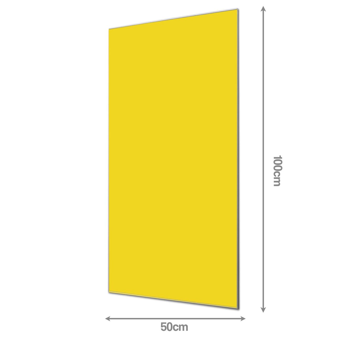 Material: 4mm Sicherheitsglas mit Metallrückwand Eigenschaften: beschreibbar, magnetisch, kratzfest Maße: 50x100x0,6cm, 7,50 kg schwer Farbe Nummer 0010 Sonnengelb Zubehör: inklusive 4 Neodym-Magnete