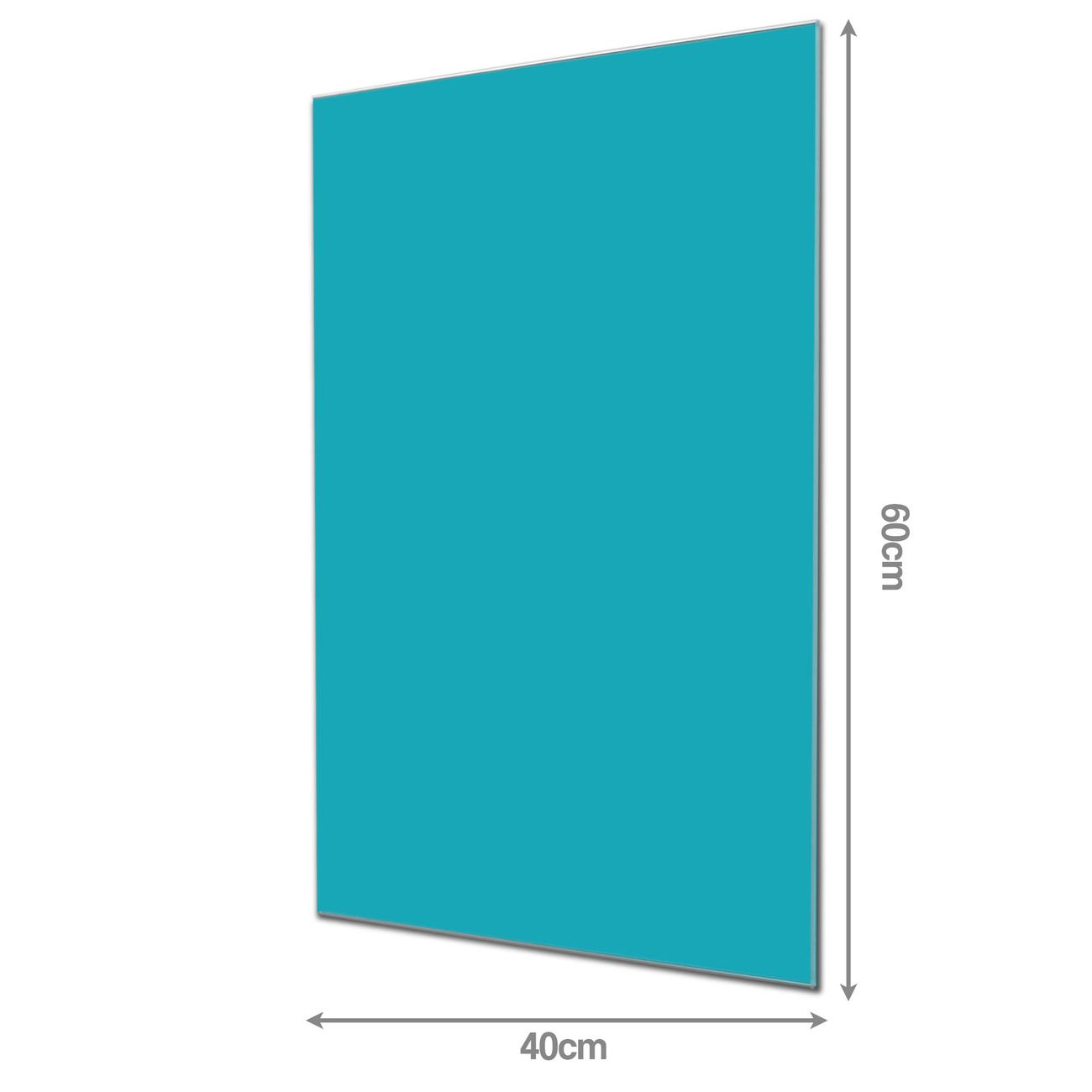 Material: 4mm Sicherheitsglas mit Metallrückwand Eigenschaften: beschreibbar, magnetisch, kratzfest Maße: 40x60x0,6cm, 3,60 kg schwer Farbe Nummer 0018 Türkis Zubehör: inklusive 4 Neodym-Magnete