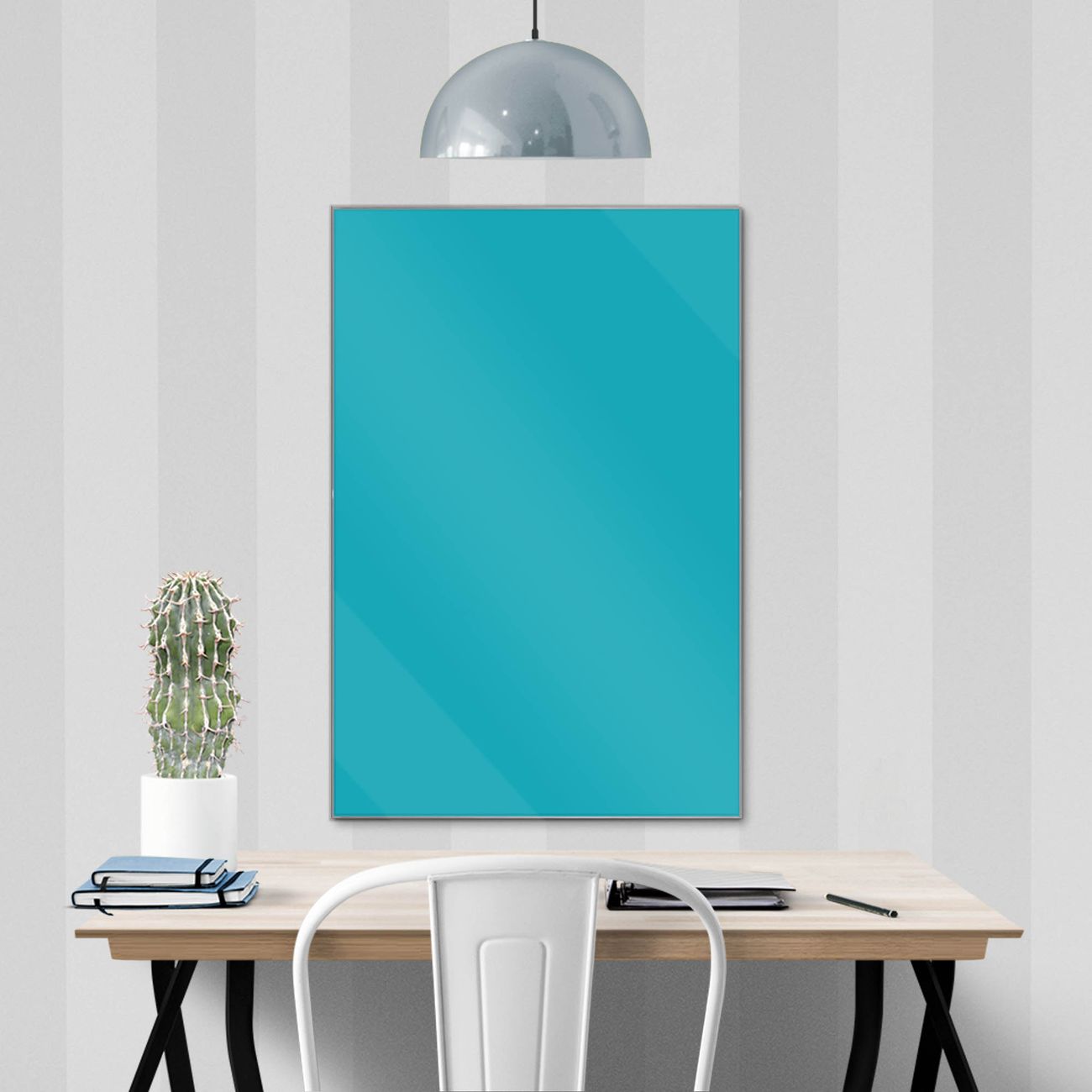 Material  4mm Sicherheitsglas mit Metallrückwand Eigenschaften  beschreibbar, magnetisch, kratzfest Maße  60x90x0,6cm, 8,10 kg schwer Farbe  Nummer 18 Türkis Zubehör  inklusive 4 Neodym-Magnete