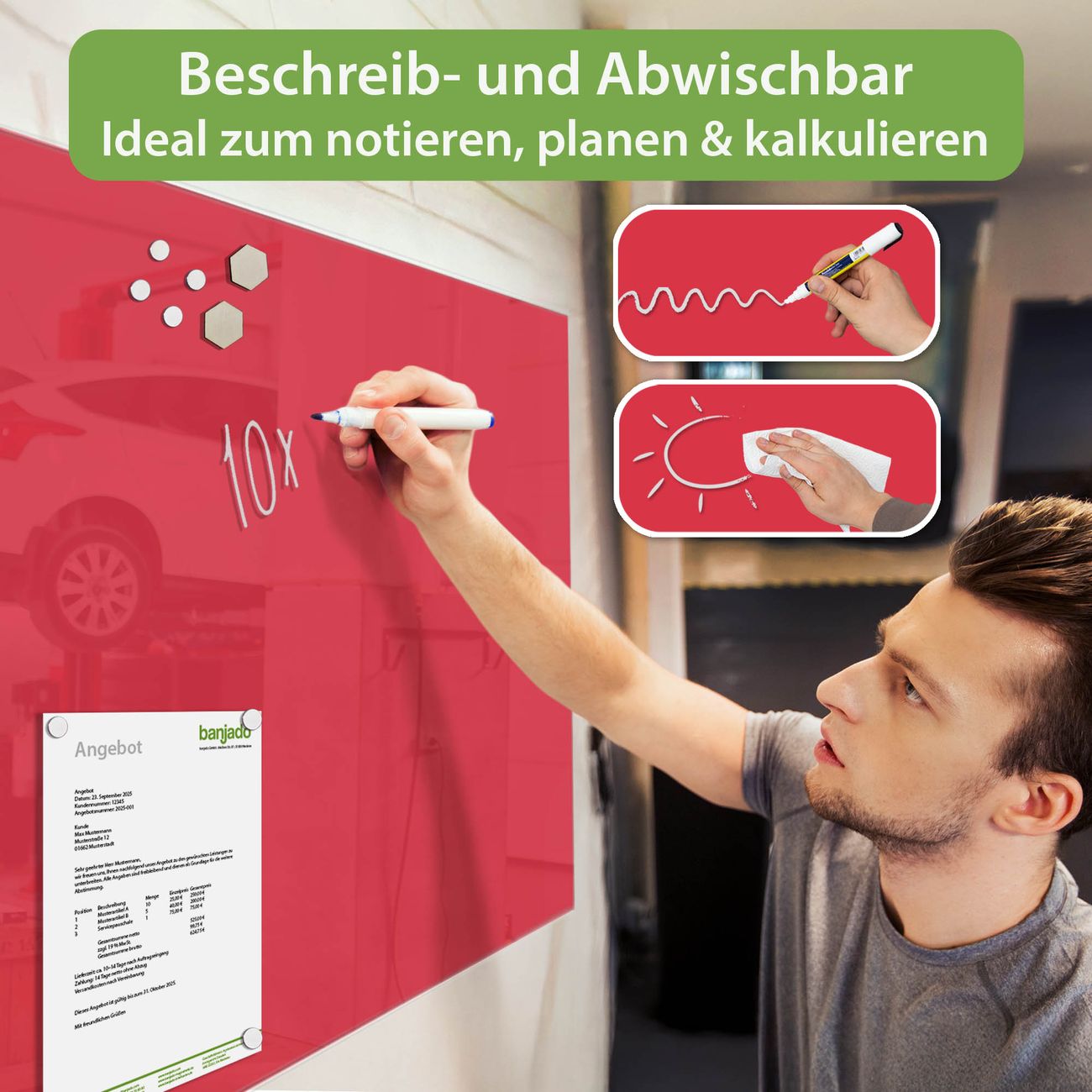 Material: 4mm Sicherheitsglas mit Metallrückwand Eigenschaften: beschreibbar, magnetisch, kratzfest Maße: 120x80x0,6cm, 14,40kg schwer Farbe Nummer 0012 Feuerrot Zubehör: inklusive 4 Neodym-Magnete