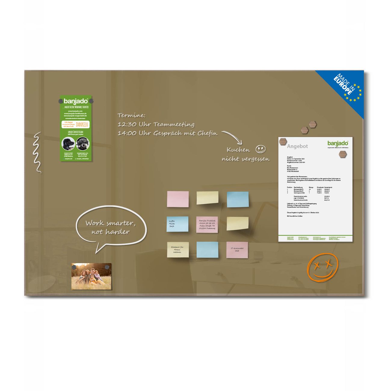 Bitte beachten Sie, dass ausschliessliche spezielle Magnete an der Glastafel haften. Wir empfehlen banjado Neodym Magnete, diese sind durch uns auf Wirksamkeit geprüft.