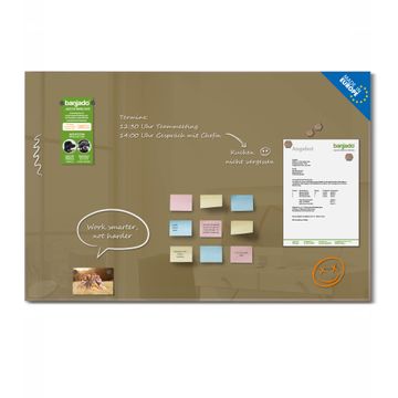 Material: 4mm Sicherheitsglas mit Metallrückwand Eigenschaften: beschreibbar, magnetisch, kratzfest Maße: 60x40x0,6cm, 3,6kg schwer Farbe Nummer 0027 Gold Metallic Zubehör: inklusive 4 Neodym-Magnete