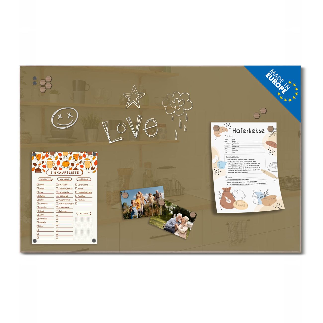 Material: 4mm Sicherheitsglas mit Metallrückwand Eigenschaften: beschreibbar, magnetisch, kratzfest Maße: 45x30x0,6cm, 2,03kg schwer Farbe Nummer 0027 Gold Metallic Zubehör: inklusive 4 Neodym-Magnete