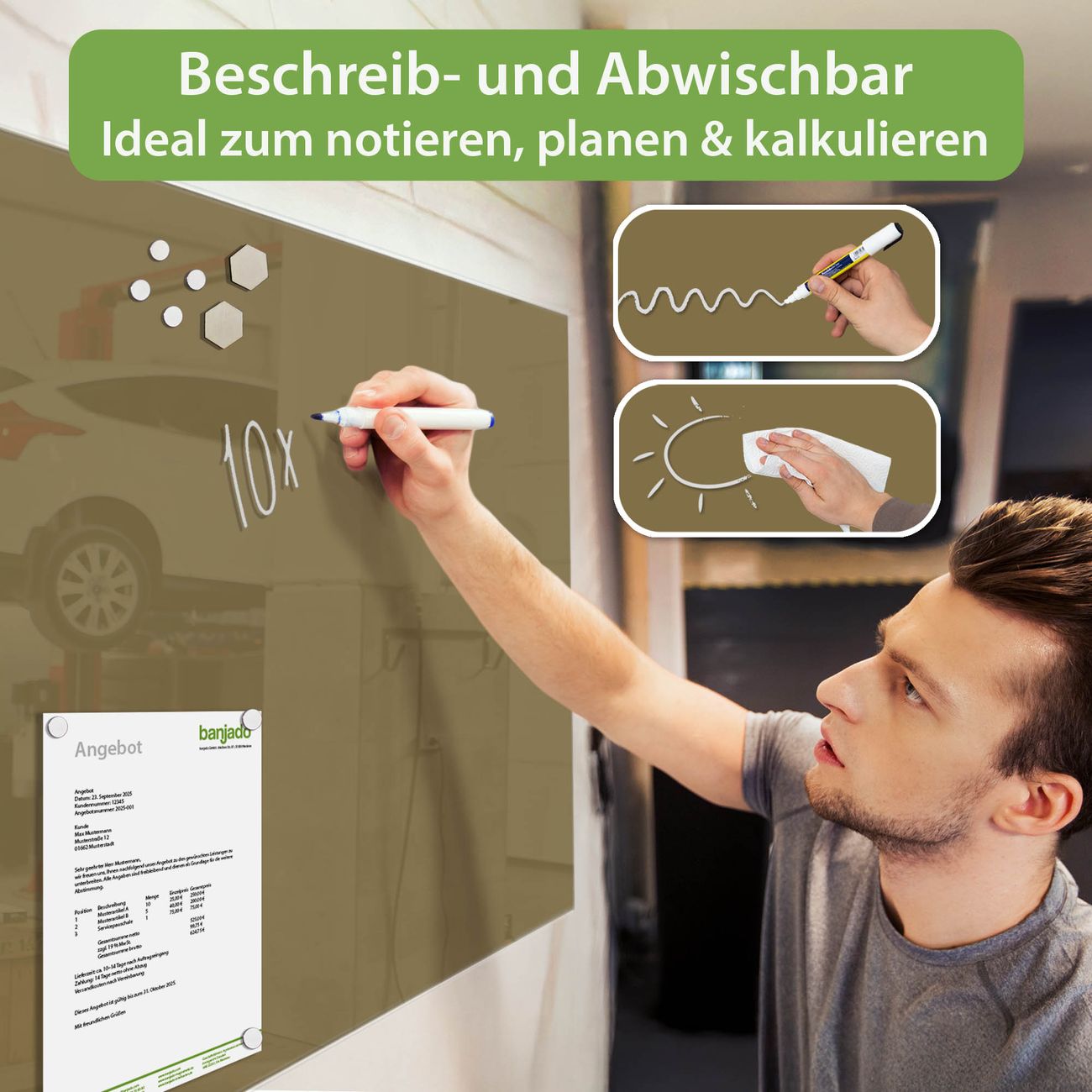 Bitte beachten Sie, dass ausschliessliche spezielle Magnete an der Glastafel haften. Wir empfehlen banjado Neodym Magnete, diese sind durch uns auf Wirksamkeit geprüft.
