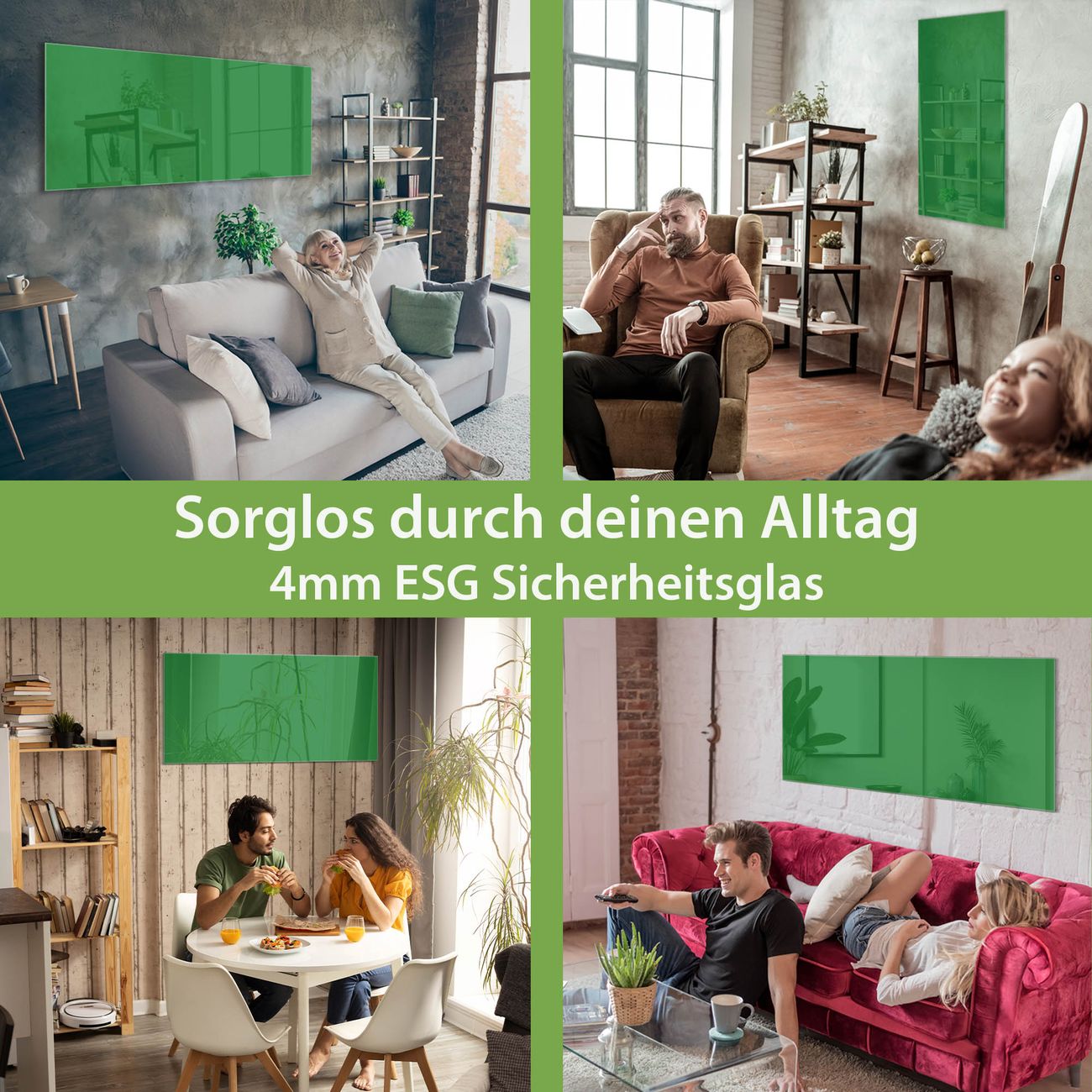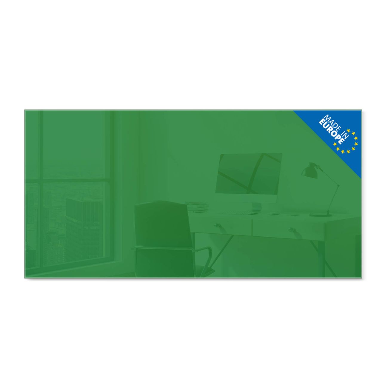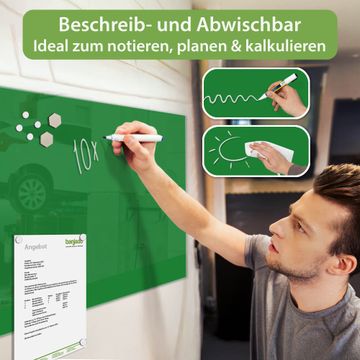 Material: 4mm Sicherheitsglas mit Metallrückwand Eigenschaften: beschreibbar, magnetisch, kratzfest Maße: 100x50x0,6cm, 7,50kg schwer Farbe Nummer 0017 Grün Zubehör: inklusive 4 Neodym-Magnete