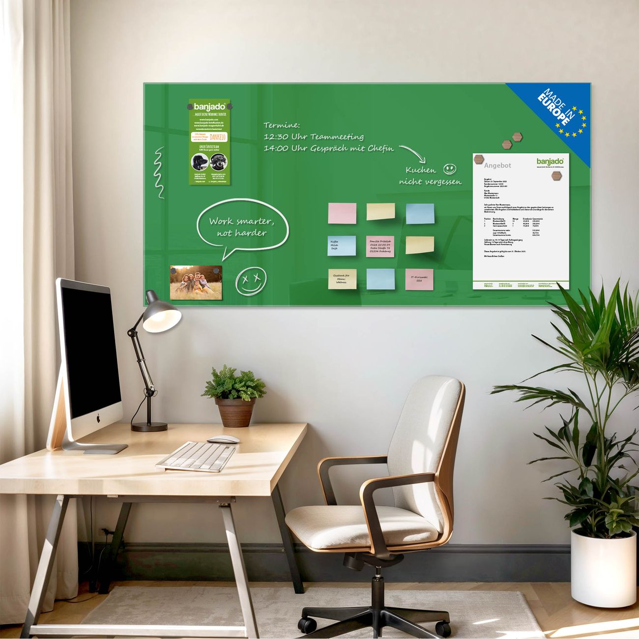 Jede Glas Magnettafel wird in unserer Werkstatt von Hand gefertigt und sorgfältig geprüft. So erhalten Sie ein echtes Qualitätsprodukt, das Funktion und Ästhetik perfekt vereint.?? Warum banjado?