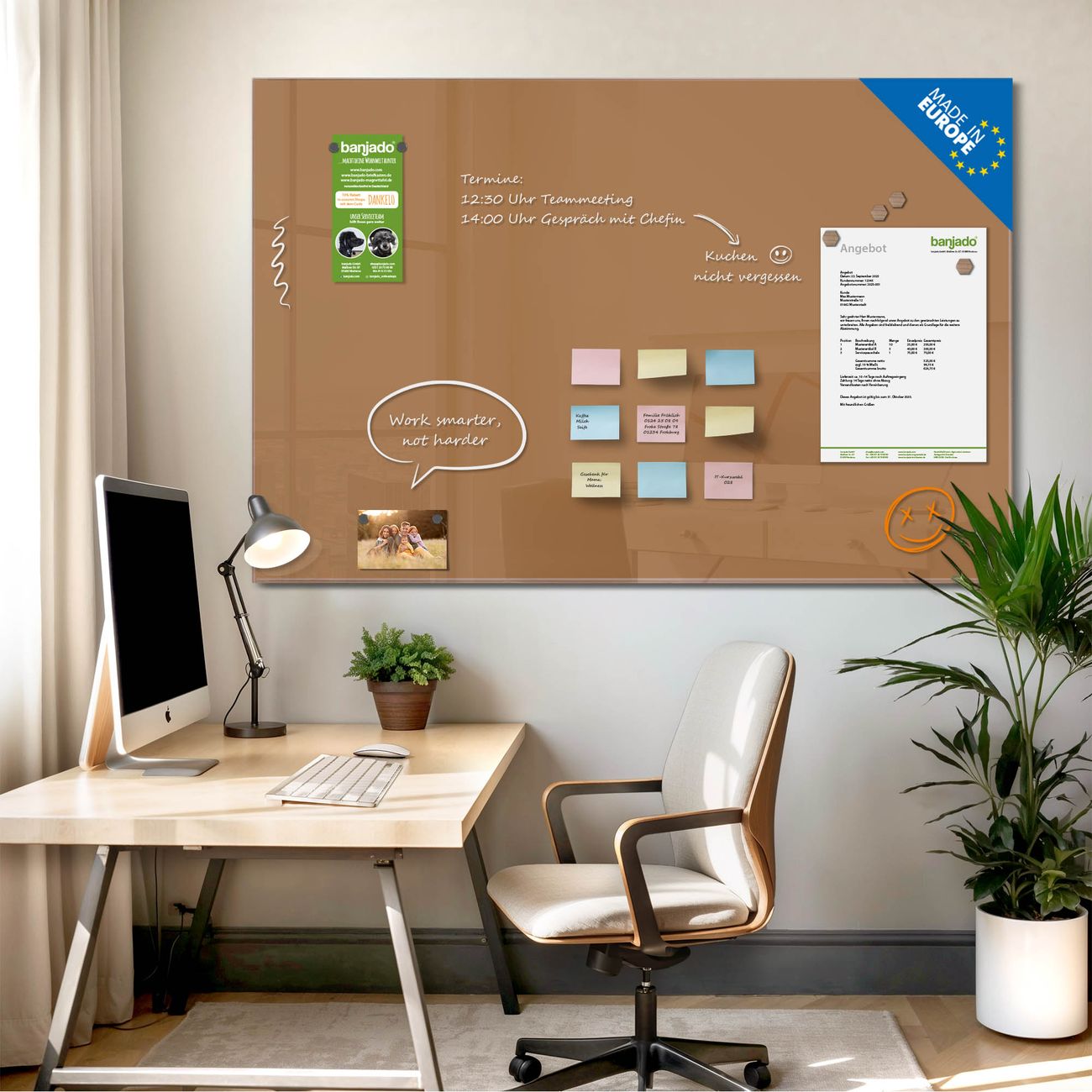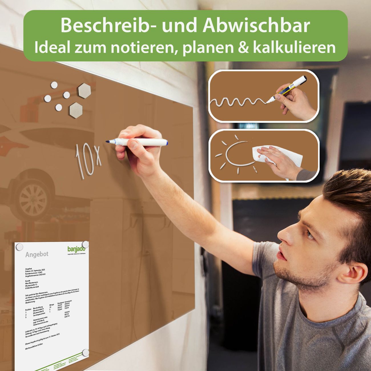Die banjado Glas Magnettafel mit dem Motiv Farbe Kupfer Metallic verbindet Funktionalität mit Stil. Sie ersetzt das Zettelchaos durch klare Strukturen und bringt dabei eine warme, natürliche Atmosphäre in Ihr Zuhause. Ob im Büro, in der Küche oder im Eingangsbereich - dieses Design-Board zieht Blicke an und sorgt für Ordnung mit Charakter.