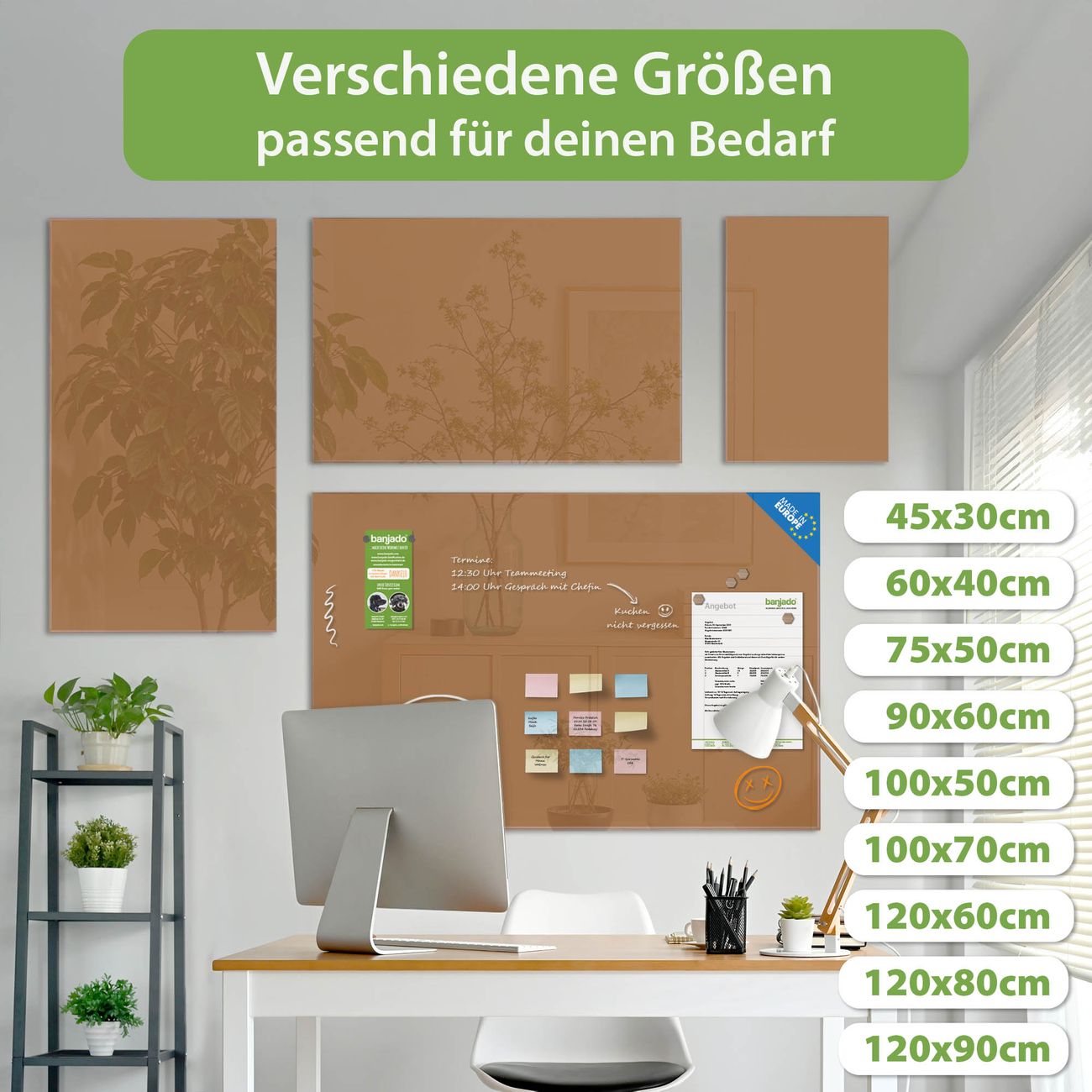 Material: 4mm Sicherheitsglas mit Metallrückwand Eigenschaften: beschreibbar, magnetisch, kratzfest Maße: 75x50x0,6cm, 5,63kg schwer Farbe Nummer 0025 Kupfer Metallic Zubehör: inklusive 4 Neodym-Magnete