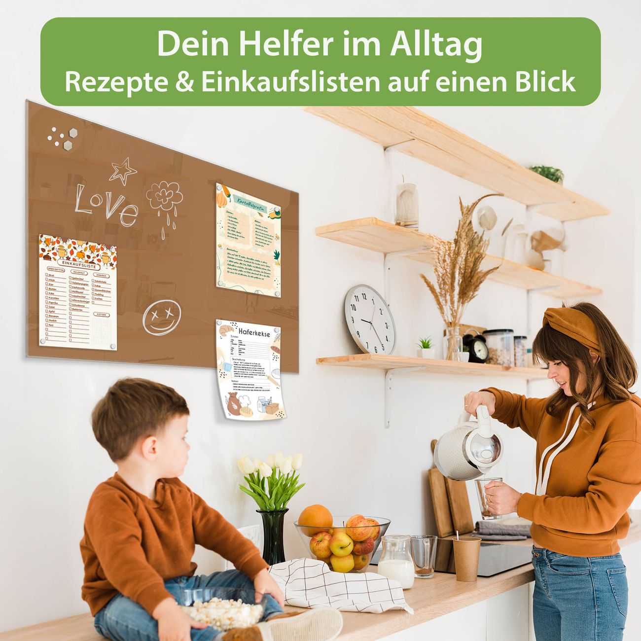 Auf der glatten Glasoberfläche lassen sich Termine, Rezepte oder Notizen ganz einfach mit Kreidestiften festhalten und rückstandslos entfernen. Starke Neodym-Magnete halten Ihre wichtigsten Erinnerungen sicher an Ort und Stelle. So entsteht Ihre ganz persönliche Ideenwand - jeden Tag neu.