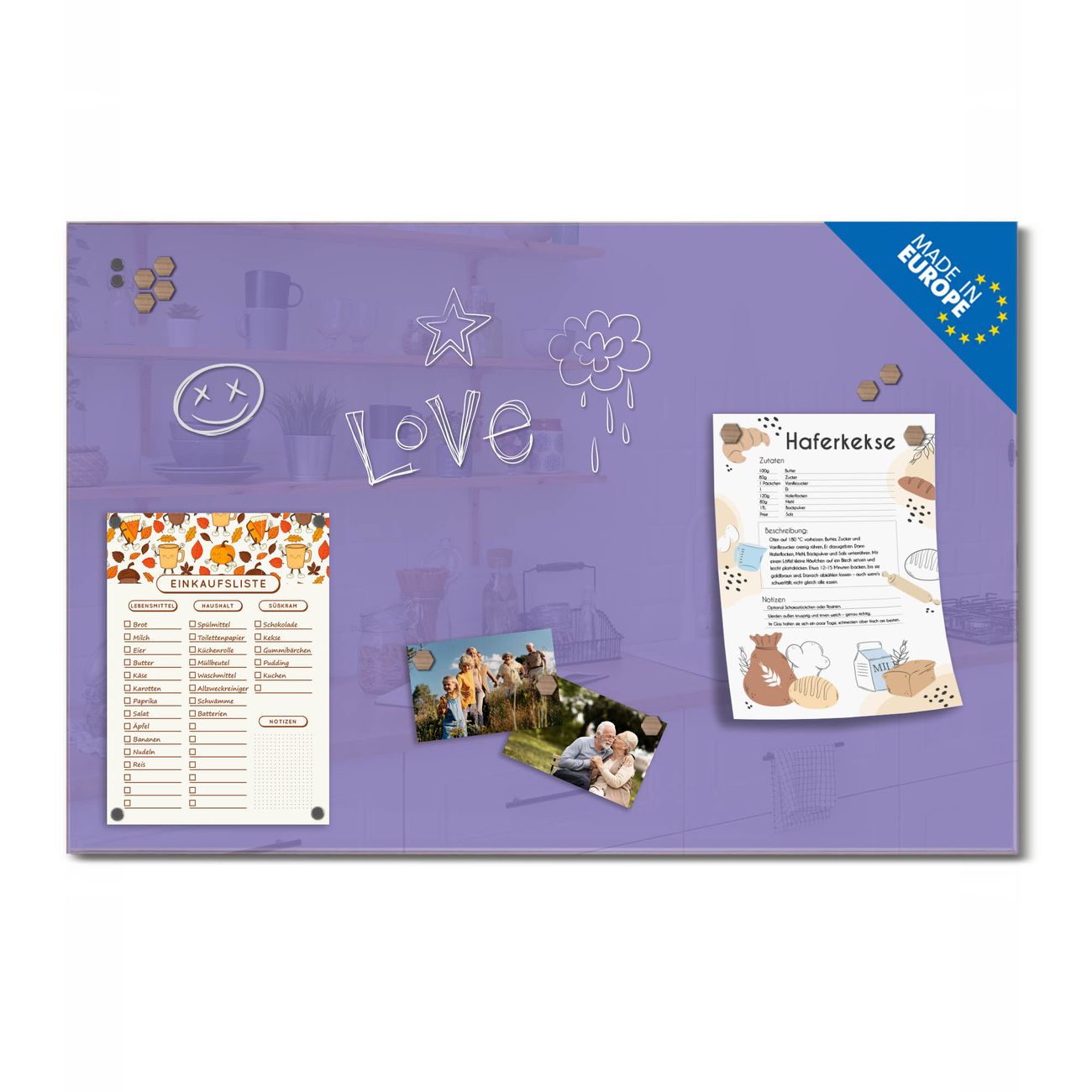 Material: 4mm Sicherheitsglas mit Metallrückwand Eigenschaften: beschreibbar, magnetisch, kratzfest Maße: 75x50x0,6cm, 5,63kg schwer Farbe Nummer 0015 Lavendel Zubehör: inklusive 4 Neodym-Magnete