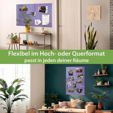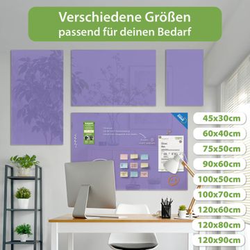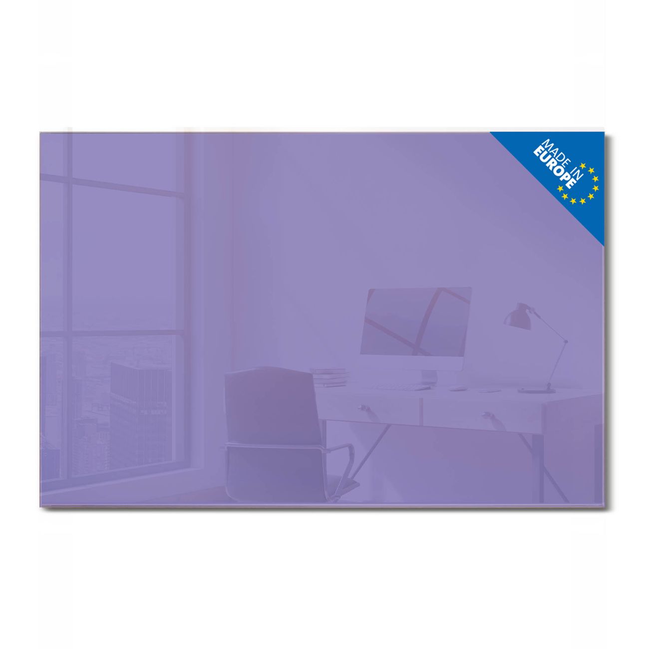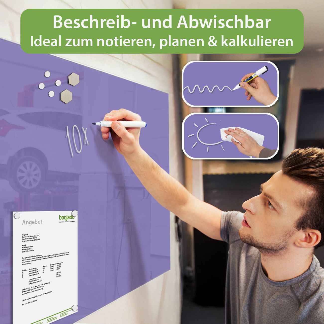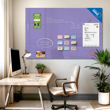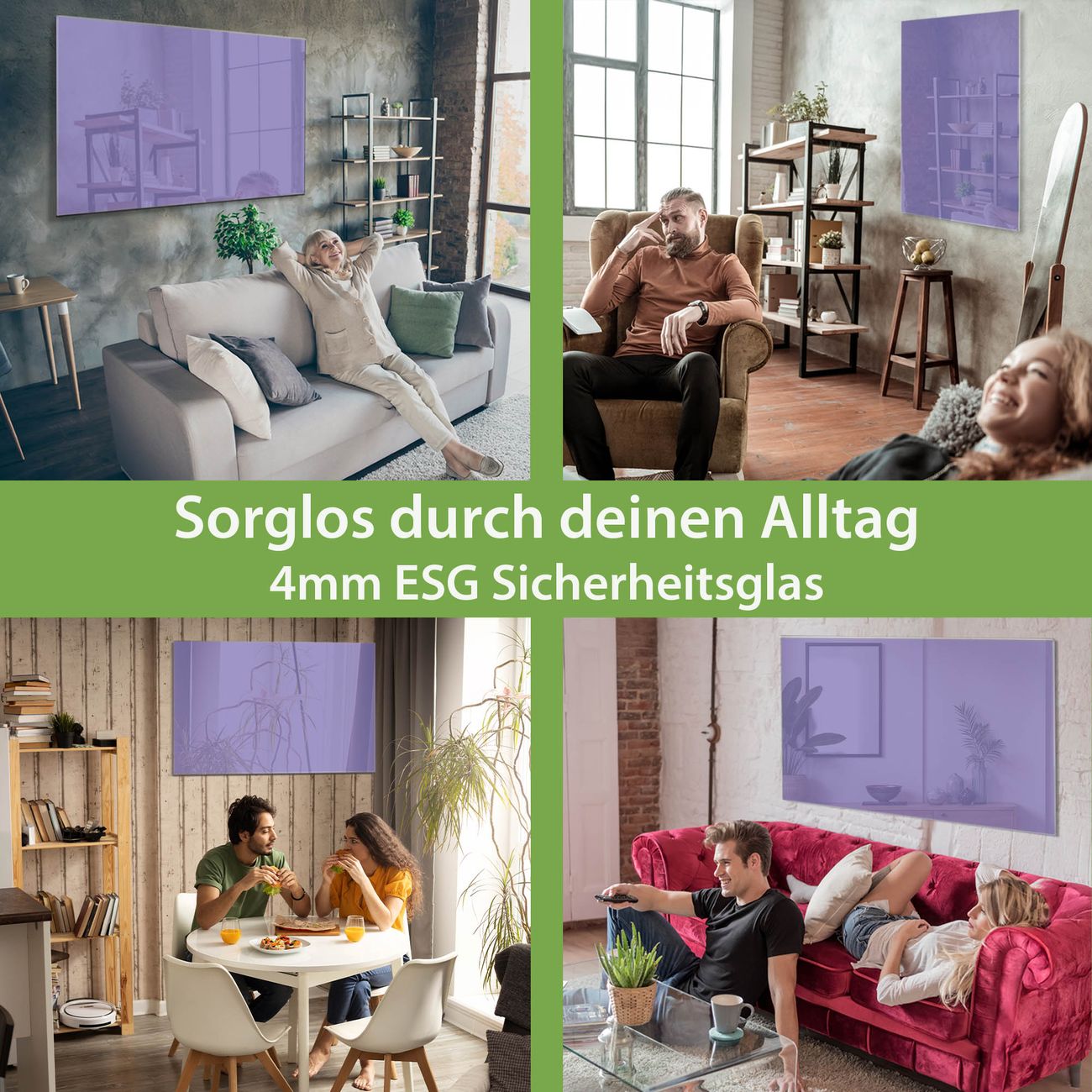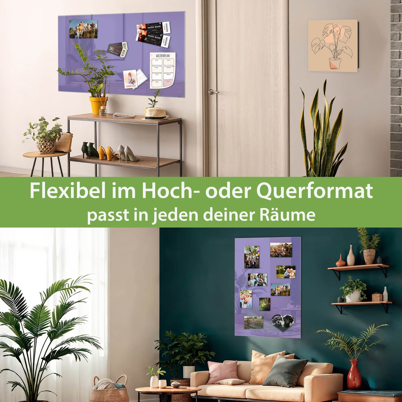 Material: 4mm Sicherheitsglas mit Metallrückwand Eigenschaften: beschreibbar, magnetisch, kratzfest Maße: 90x60x0,6cm, 8,10kg schwer Farbe Nummer 0015 Lavendel Zubehör: inklusive 4 Neodym-Magnete