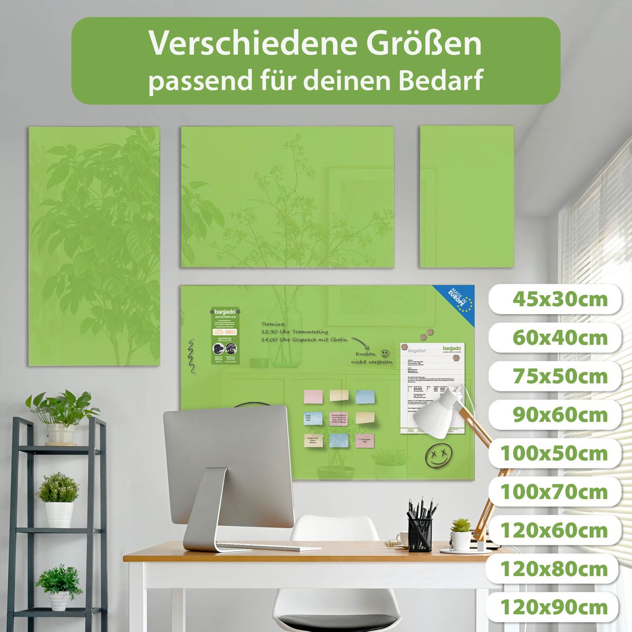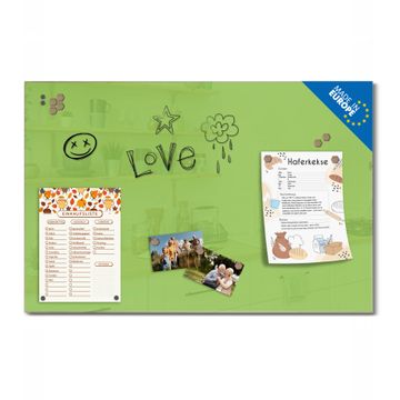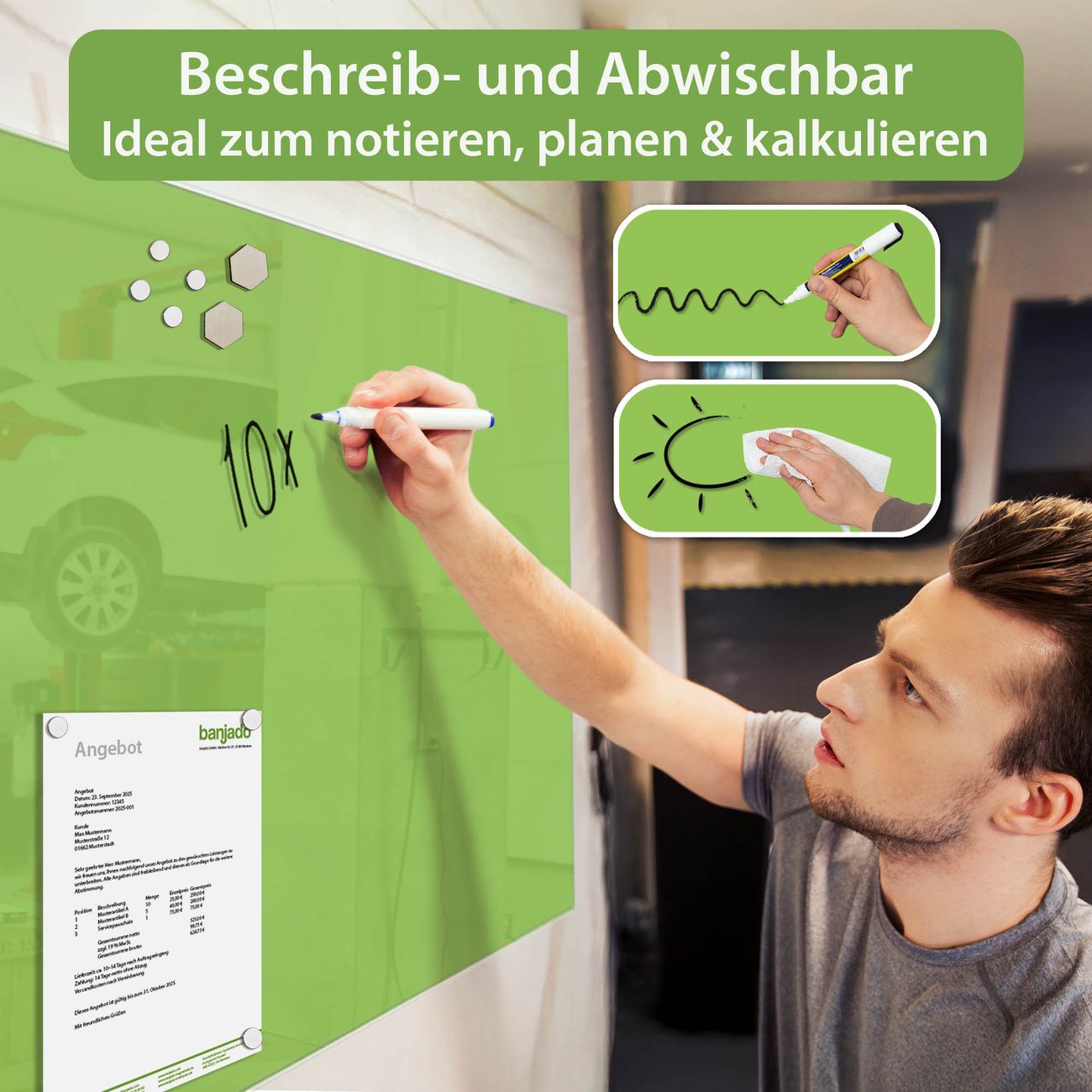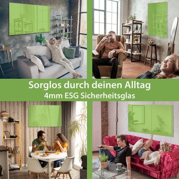 Material: 4mm Sicherheitsglas mit Metallrückwand Eigenschaften: beschreibbar, magnetisch, kratzfest Maße: 90x60x0,6cm, 8,10kg schwer Farbe Nummer 0016 Limettengrün Zubehör: inklusive 4 Neodym-Magnete