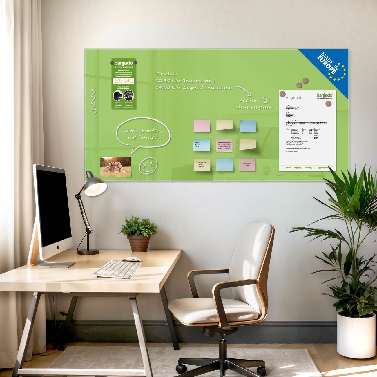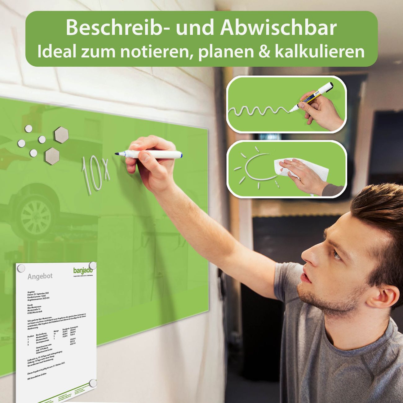 Jede Glas Magnettafel wird in unserer Werkstatt von Hand gefertigt und sorgfältig geprüft. So erhalten Sie ein echtes Qualitätsprodukt, das Funktion und Ästhetik perfekt vereint.?? Warum banjado?