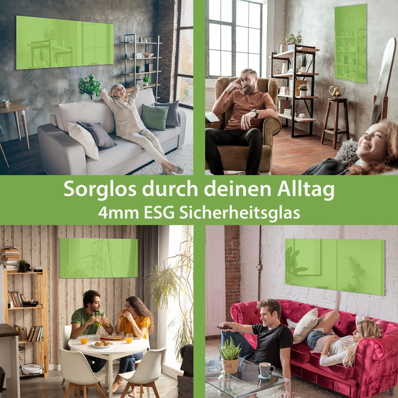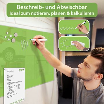 Material: 4mm Sicherheitsglas mit Metallrückwand Eigenschaften: beschreibbar, magnetisch, kratzfest Maße: 120x60x0,6cm, 10,80kg schwer Farbe Nummer 0016 Limettengrün Zubehör: inklusive 4 Neodym-Magnete