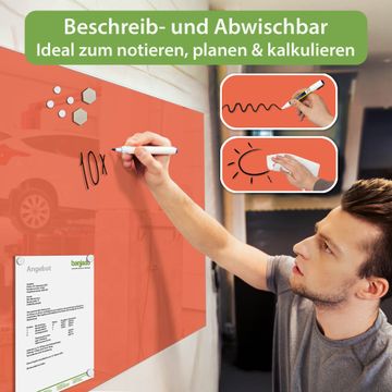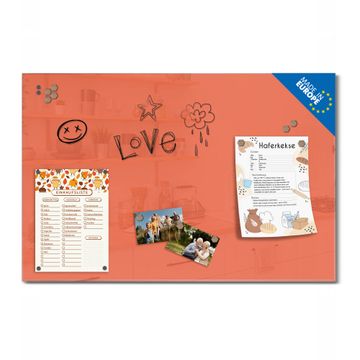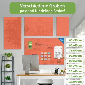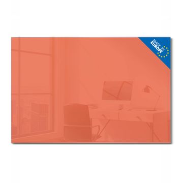 Material: 4mm Sicherheitsglas mit Metallrückwand Eigenschaften: beschreibbar, magnetisch, kratzfest Maße: 75x50x0,6cm, 5,63kg schwer Farbe Nummer 0011 Orange Zubehör: inklusive 4 Neodym-Magnete