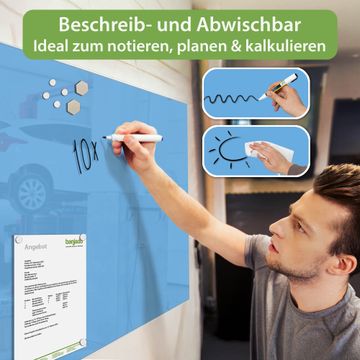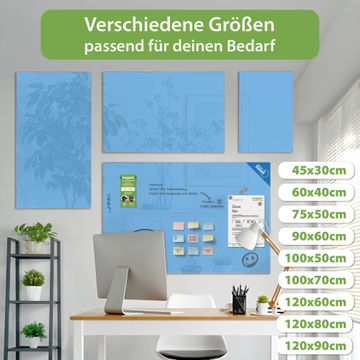 Material: 4mm Sicherheitsglas mit Metallrückwand Eigenschaften: beschreibbar, magnetisch, kratzfest Maße: 45x30x0,6cm, 2,03kg schwer Farbe Nummer 0019 Pastellblau Zubehör: inklusive 4 Neodym-Magnete