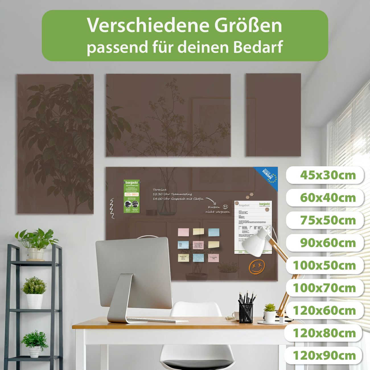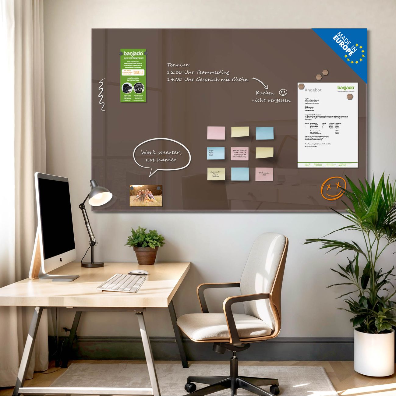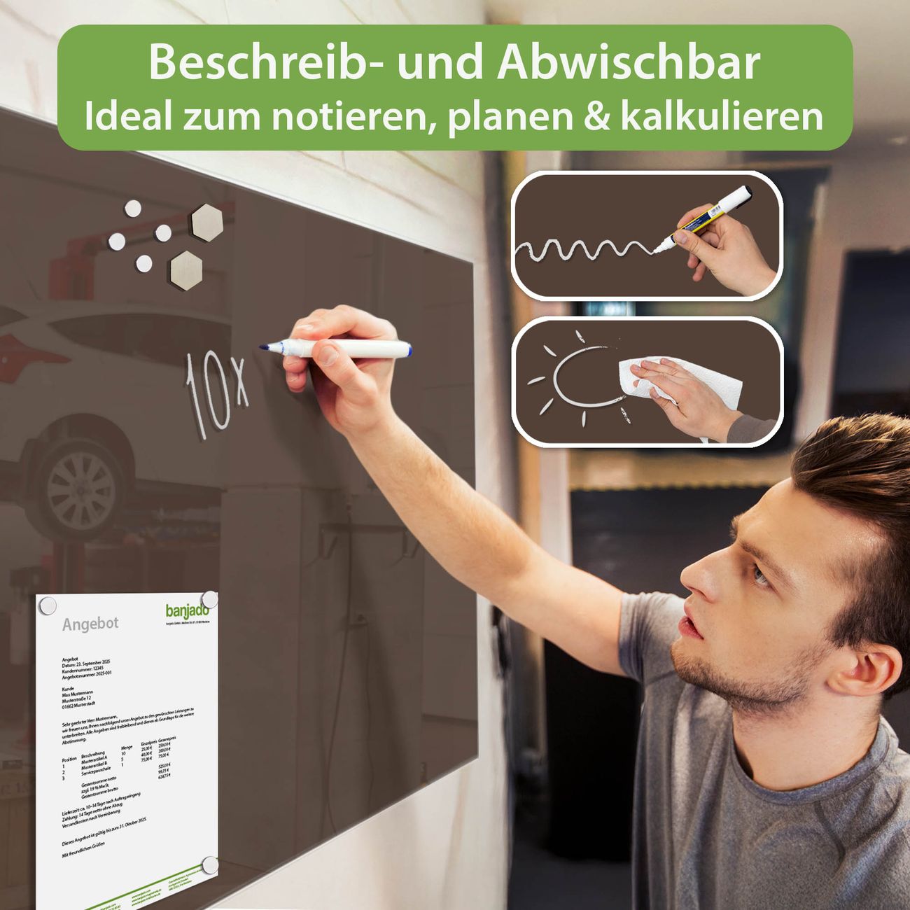 Jede Glas Magnettafel wird in unserer Werkstatt von Hand gefertigt und sorgfältig geprüft. So erhalten Sie ein echtes Qualitätsprodukt, das Funktion und Ästhetik perfekt vereint.?? Warum banjado?