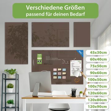 Material: 4mm Sicherheitsglas mit Metallrückwand Eigenschaften: beschreibbar, magnetisch, kratzfest Maße: 45x30x0,6cm, 2,03kg schwer Farbe Nummer 0021 Schokobraun Zubehör: inklusive 4 Neodym-Magnete