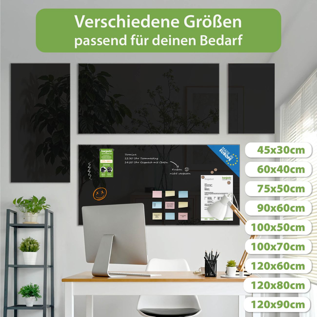 Material: 4mm Sicherheitsglas mit Metallrückwand Eigenschaften: beschreibbar, magnetisch, kratzfest Maße: 100x50x0,6cm, 7,50kg schwer Farbe Nummer 0023 Tiefschwarz Zubehör: inklusive 4 Neodym-Magnete