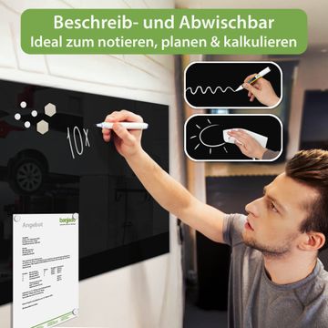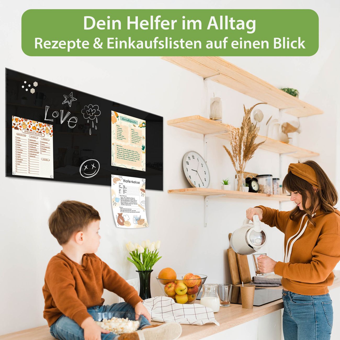 Auf der glatten Glasoberfläche lassen sich Termine, Rezepte oder Notizen ganz einfach mit Kreidestiften festhalten und rückstandslos entfernen. Starke Neodym-Magnete halten Ihre wichtigsten Erinnerungen sicher an Ort und Stelle. So entsteht Ihre ganz persönliche Ideenwand - jeden Tag neu.