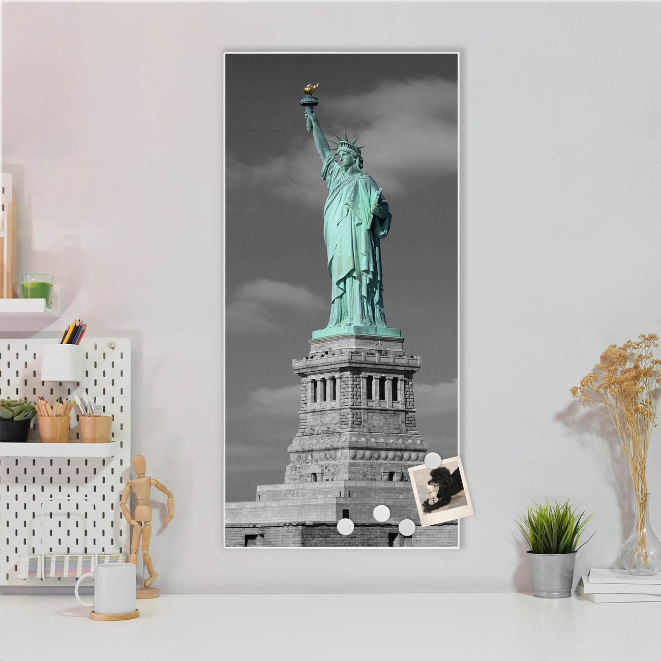 Motiv Freiheitsstatue Nr. 10173 Größe: 37x78x2cm BxHxT Gewicht: ca. 2,10 kg Material: Stahl weiß lackiert, Premiumfolie Magnete: für Dekomagnete geeignet beschreibbar: Nein Format: Hochformat Zubehör: 4 Magnete, Schrauben und Dübel