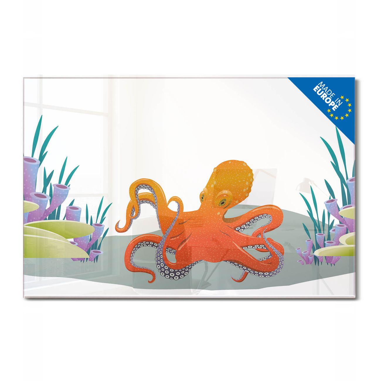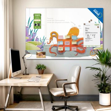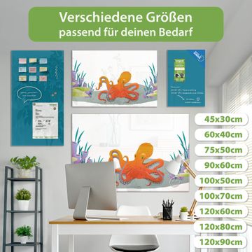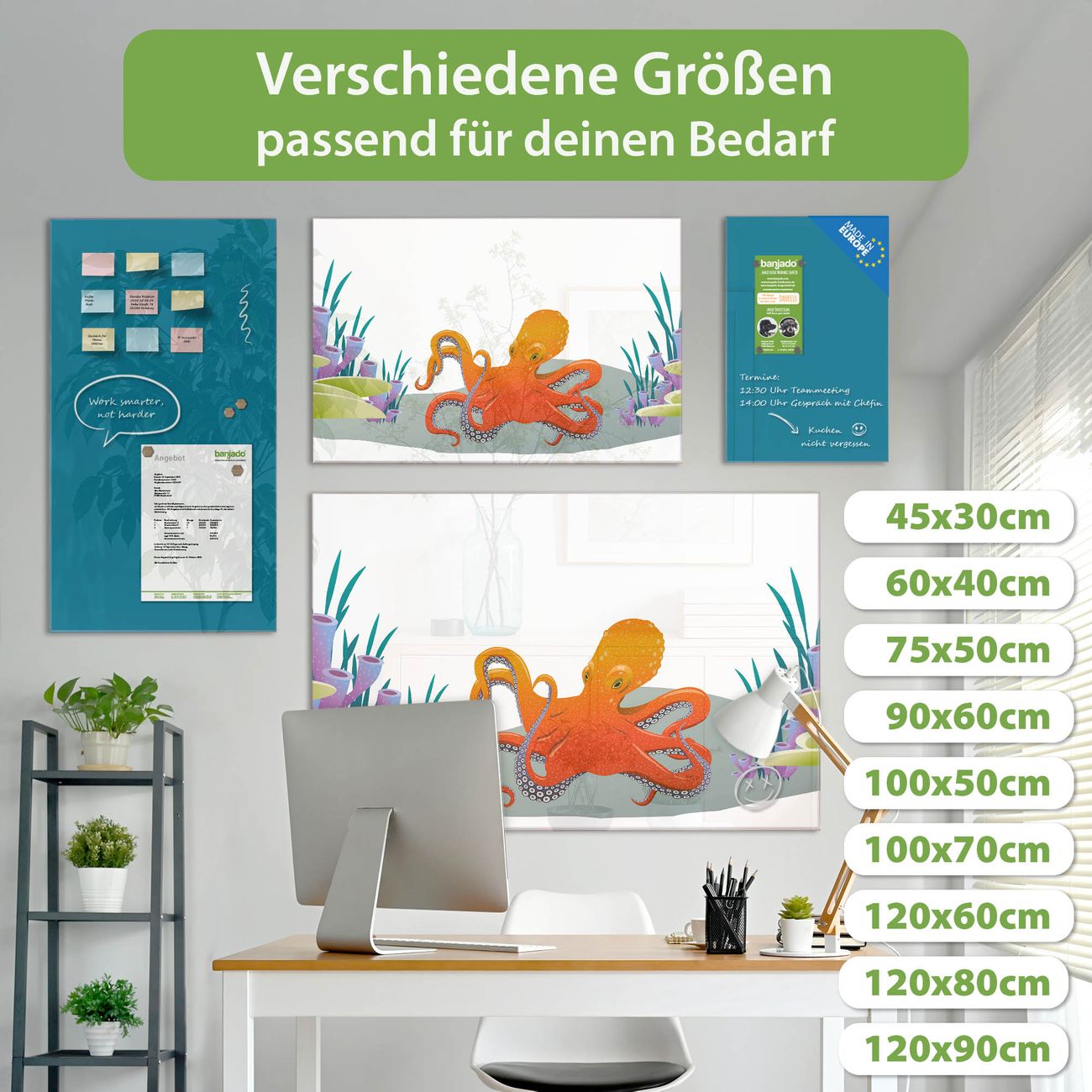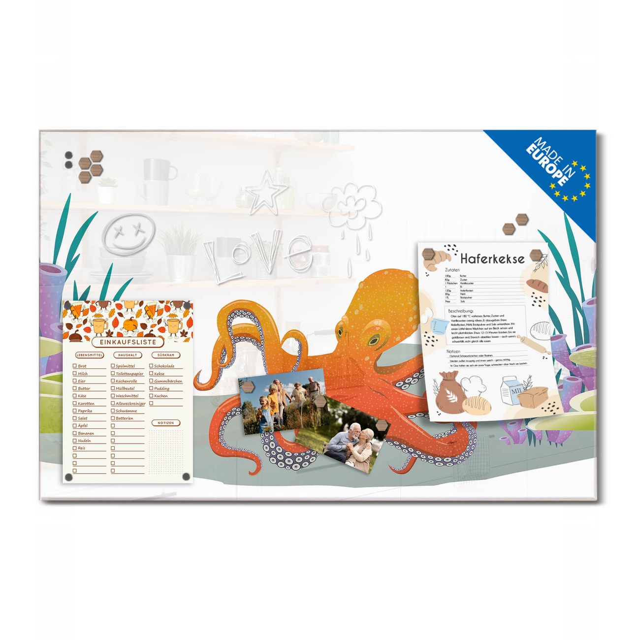 Material: 4mm Sicherheitsglas mit Metallrückwand Eigenschaften: beschreibbar, magnetisch, kratzfest Maße: 75x50x0,6cm, 5,63kg schwer Motiv Nummer 13566 Abenteuer im Ozean Zubehör: inklusive 4 Neodym-Magnete
