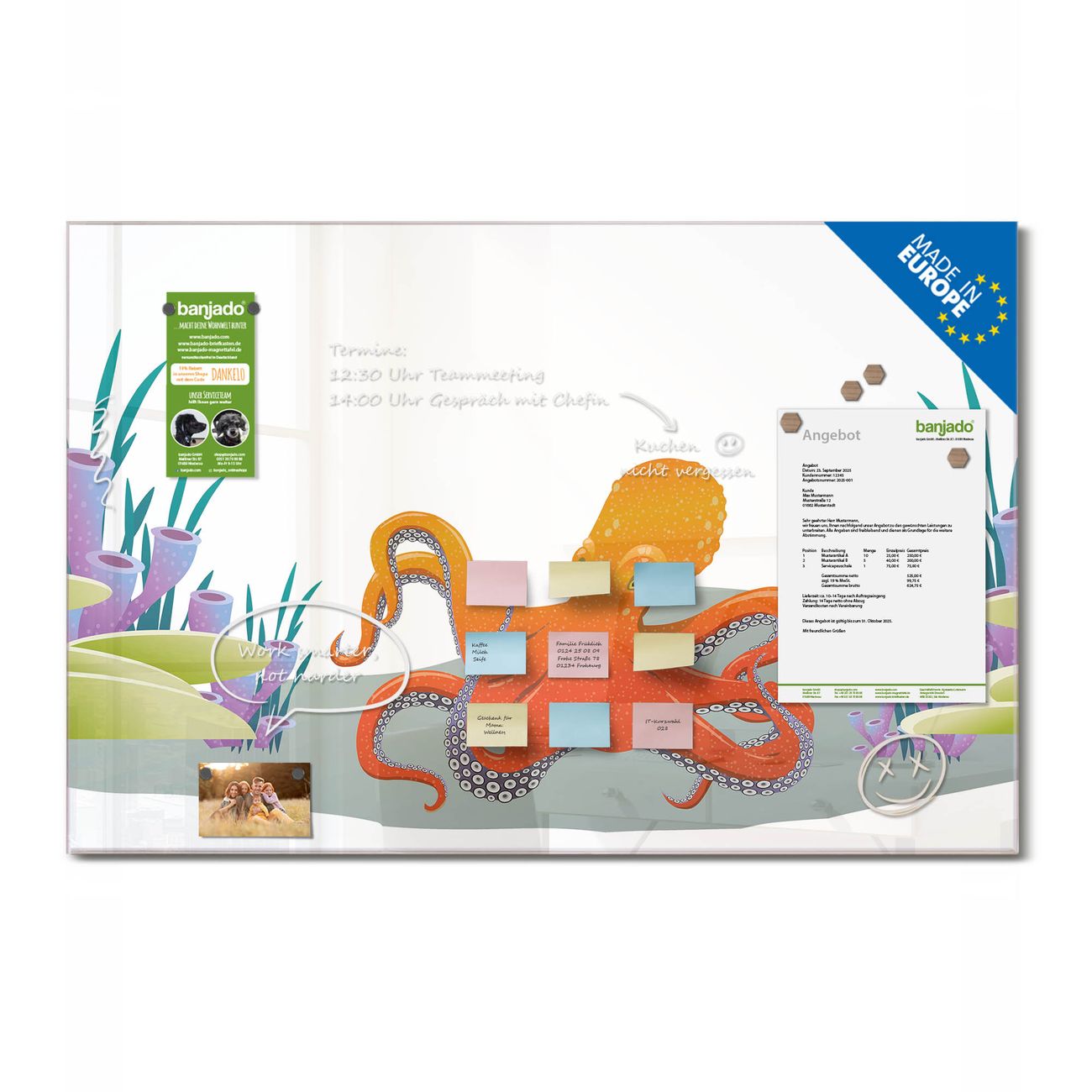 Material: 4mm Sicherheitsglas mit Metallrückwand Eigenschaften: beschreibbar, magnetisch, kratzfest Maße: 120x80x0,6cm, 14,40kg schwer Motiv Nummer 13566 Abenteuer im Ozean Zubehör: inklusive 4 Neodym-Magnete