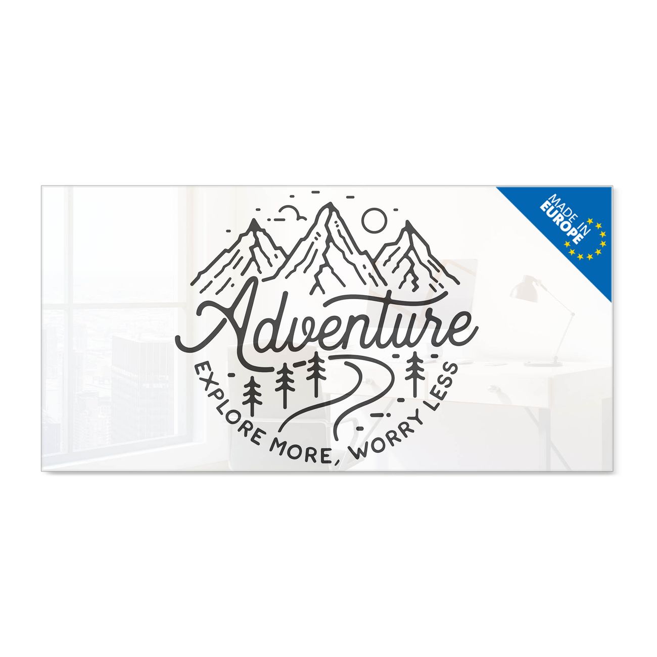Material: 4mm Sicherheitsglas mit Metallrückwand Eigenschaften: beschreibbar, magnetisch, kratzfest Maße: 100x50x0,6cm, 7,50kg schwer Motiv Nummer 13358 Abenteuerliche Bergskizze mit Spruch Zubehör: inklusive 4 Neodym-Magnete