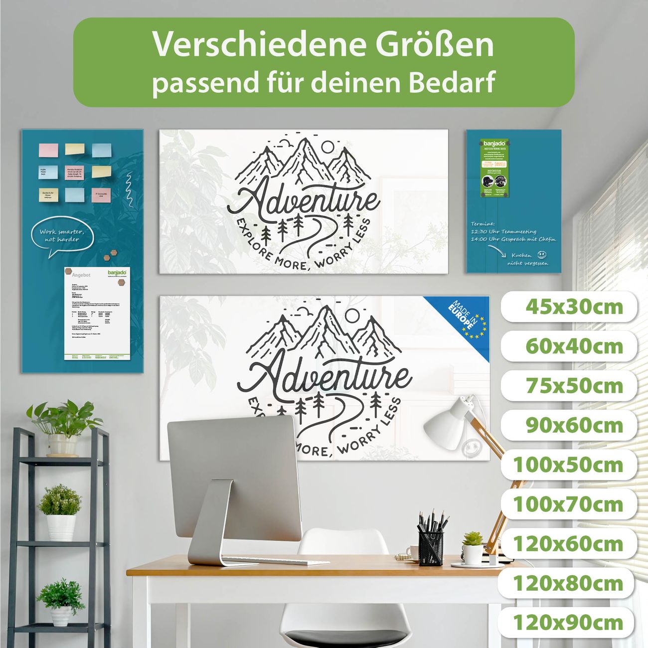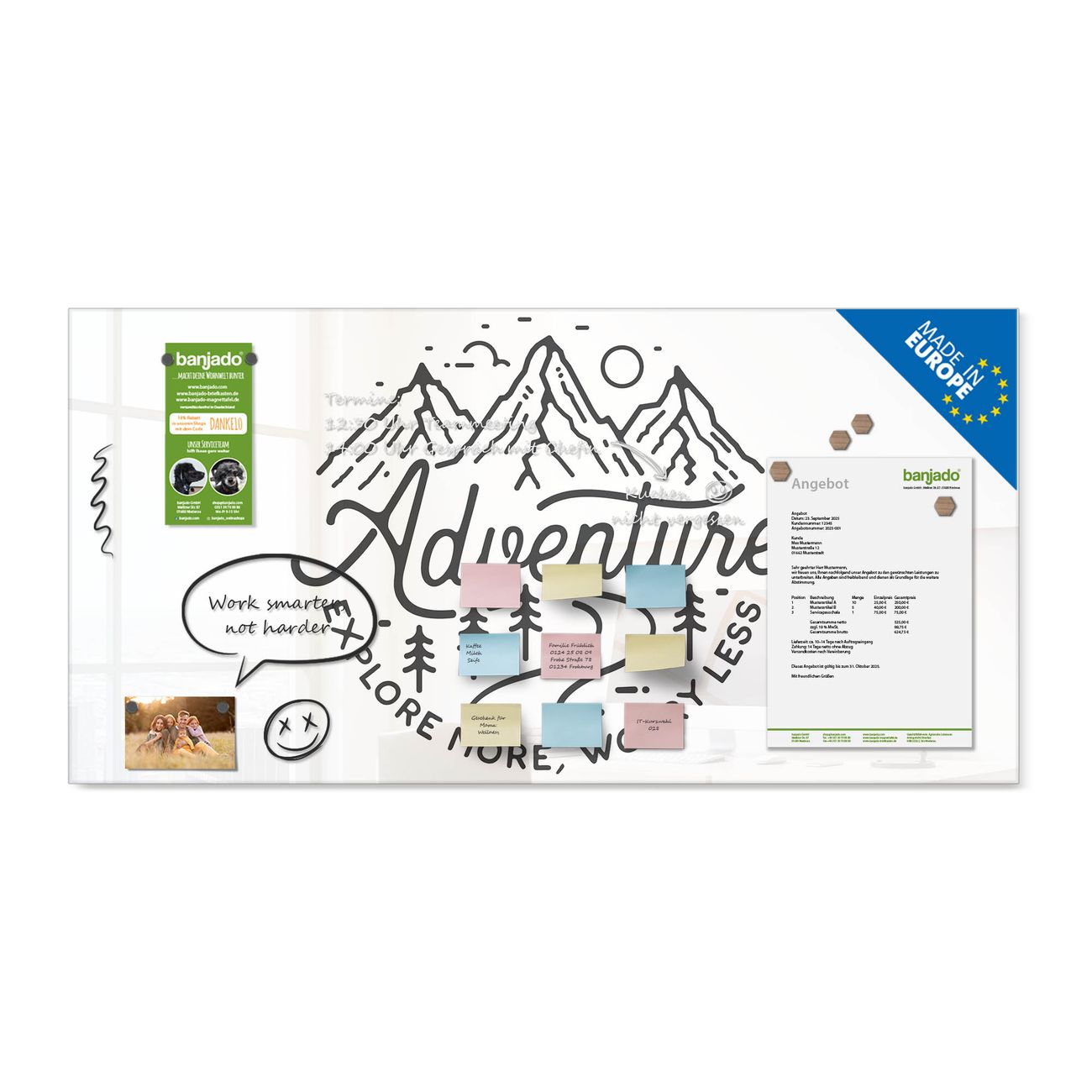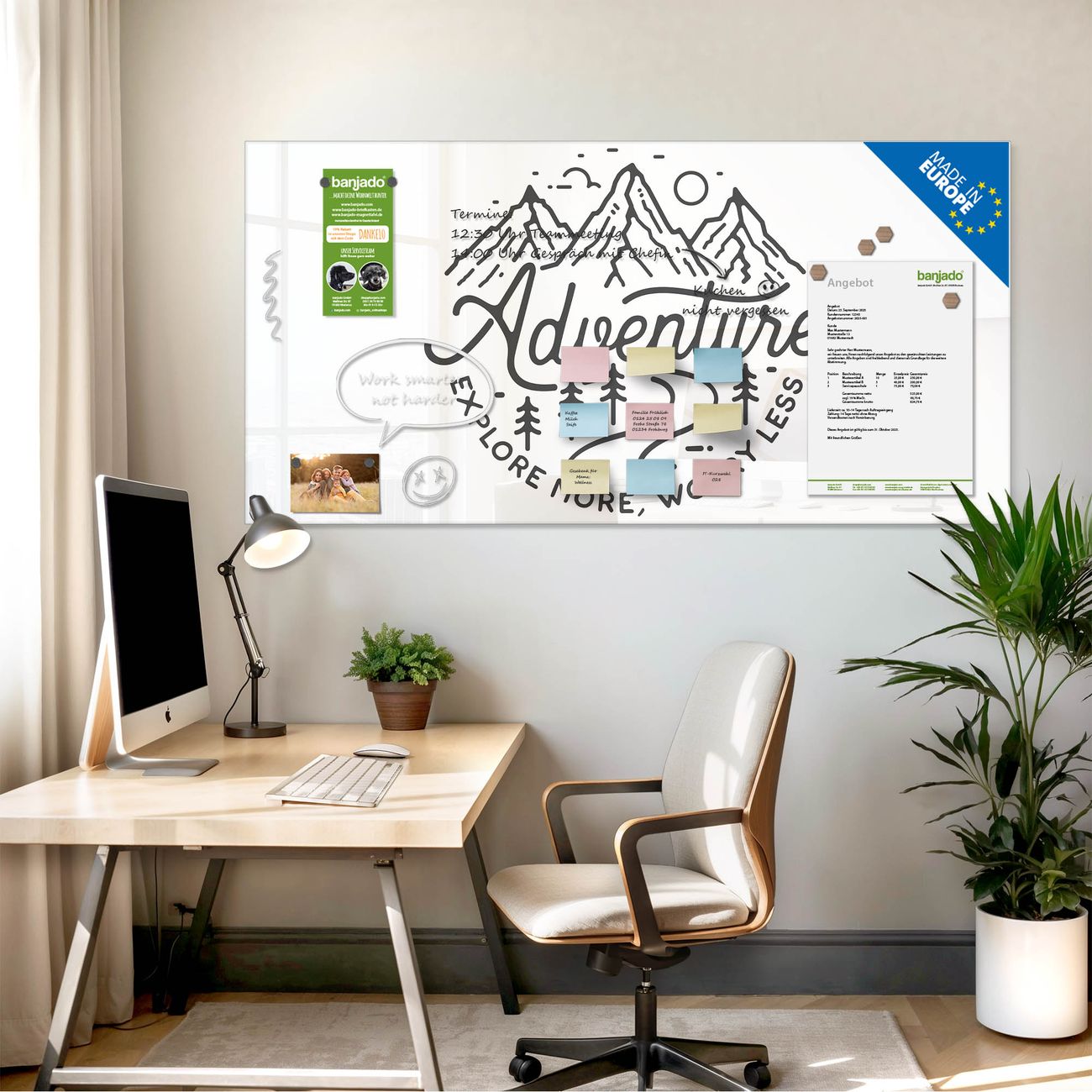 Jede Glas Magnettafel wird in unserer Werkstatt von Hand gefertigt und sorgfältig geprüft. So erhalten Sie ein echtes Qualitätsprodukt, das Funktion und Ästhetik perfekt vereint.?? Warum banjado?
