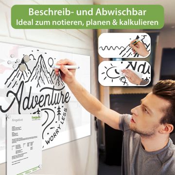 Auf der glatten Glasoberfläche lassen sich Termine, Rezepte oder Notizen ganz einfach mit Kreidestiften festhalten und rückstandslos entfernen. Starke Neodym-Magnete halten Ihre wichtigsten Erinnerungen sicher an Ort und Stelle. So entsteht Ihre ganz persönliche Ideenwand - jeden Tag neu.