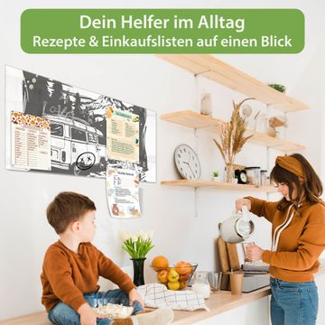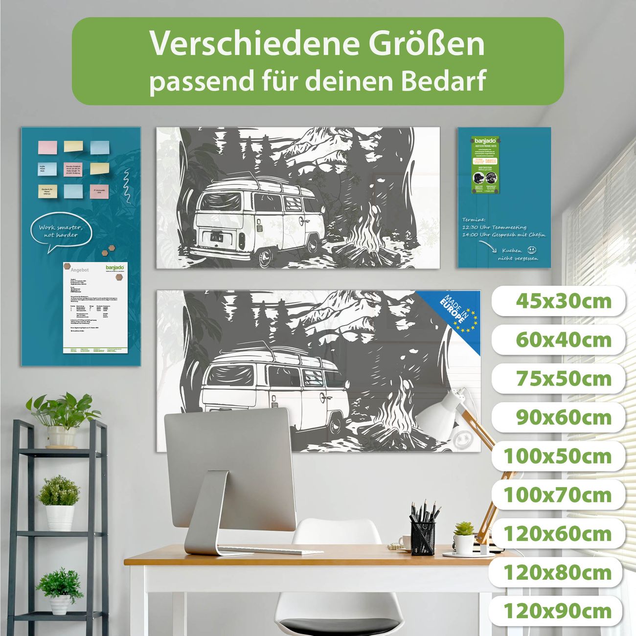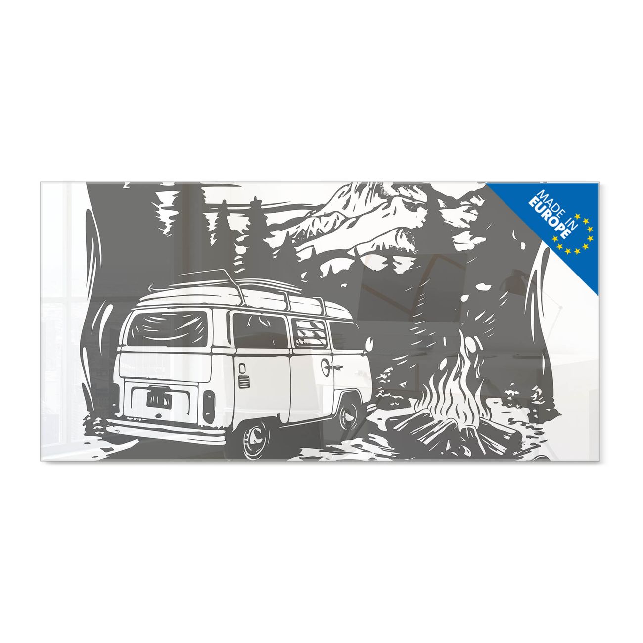 Material: 4mm Sicherheitsglas mit Metallrückwand Eigenschaften: beschreibbar, magnetisch, kratzfest Maße: 120x60x0,6cm, 10,80kg schwer Motiv Nummer 13171 Abenteuerliche Campingszene Zubehör: inklusive 4 Neodym-Magnete