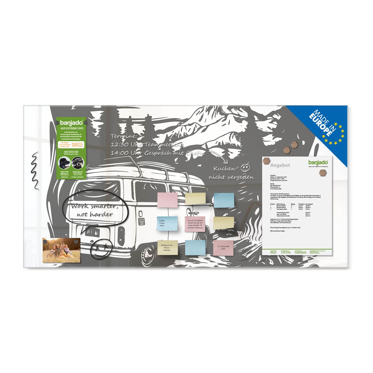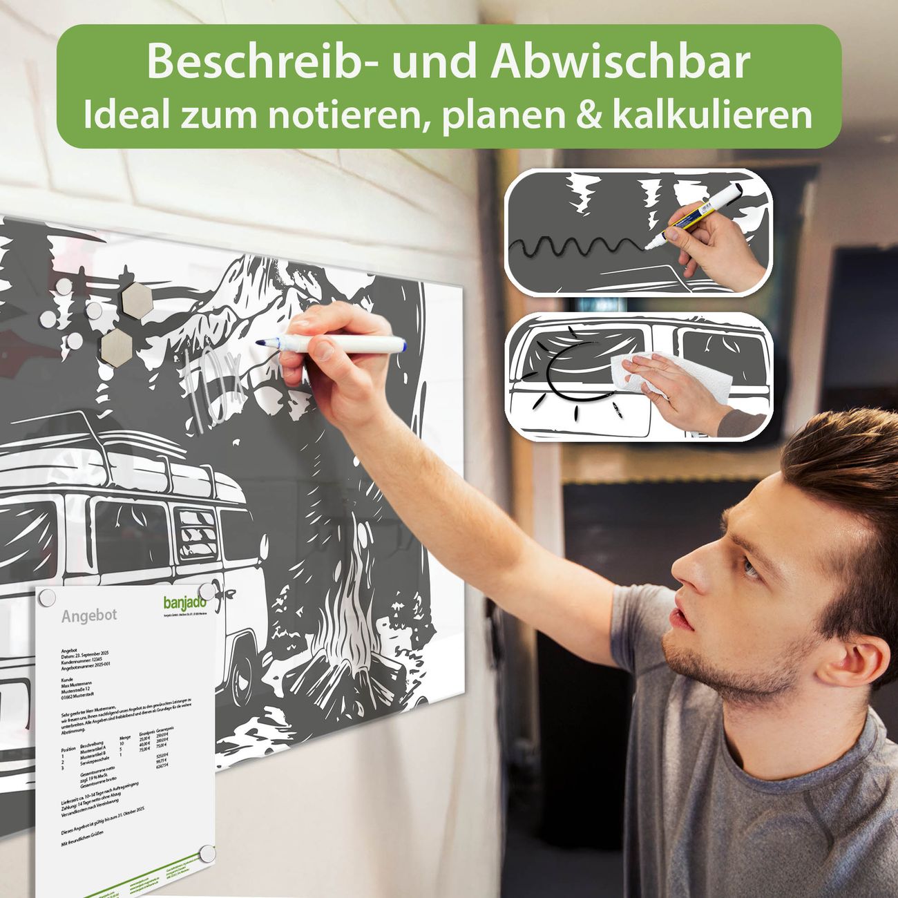 Die banjado Glas Magnettafel mit dem Motiv Motiv Abenteuerliche Campingszene verbindet Funktionalität mit Stil. Sie ersetzt das Zettelchaos durch klare Strukturen und bringt dabei eine warme, natürliche Atmosphäre in Ihr Zuhause. Ob im Büro, in der Küche oder im Eingangsbereich - dieses Design-Board zieht Blicke an und sorgt für Ordnung mit Charakter.